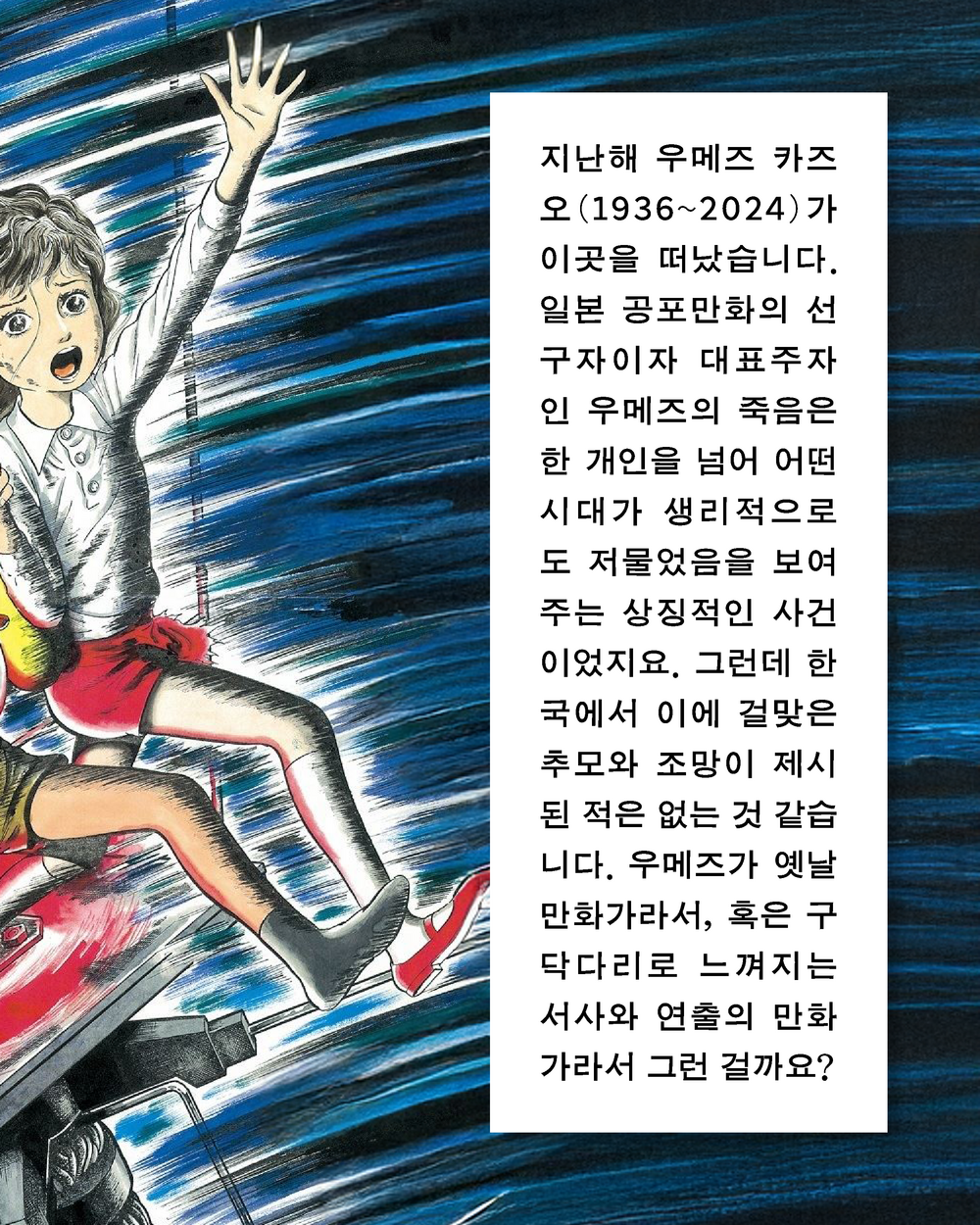 쪽프레스와 함께 하는 만화비평모임의 여덟번째 프로그램 <모로호시의 뒷모습>을 기획 및 진행했다. 한국에서도 명성이 자자한 일본의 호러만화가 모로호시 다이지로의 (적어도 국내에선) 상대적으로 덜 읽힌 작품들을 함께 읽고 논하는 작가 스터디 겸 비평 워크숍으로, 올해의 무시무시한 한여름을 관통하며 이루어졌다. 서브컬쳐 평론가이자 소설가인 손지상 씨를 오프닝 렉쳐 강사로 초청했는데, 역시나 그답게 참으로 유익하고 흥미진진한 관점을 잔뜩 펼쳐주셔서 참 보람찼다. (가령 '기'와 '괴'라는 키워드로 모로호시의 방법론을 정리한 것이라든가) 중간중간 함께 만담을 한 것도 재밌었고 말이다. 이번에는 참여를 강하게 희망하는 신청자가 너무 많아서 결국 역대 최다 인원인 25명과 함께 모임을 진행했는데, 이 때문인지 진행자로서 역할을 제대로 해내진 못했던 것 같다. 좀 더 정확히는, 진행에만 급급해서 멤버들의 의견을 잘 정리하고 적절한 피드백을 드리는 일에 상대적으로 소홀했다. 물론 이번에도 흥미진진한 의견들을 열성적으로 개진하고 나누어주신 멤버들 덕분에 보람차고 즐겁긴 했지만, 이런 아쉬움은 못내 남는다. 하여튼 열정적으로 의견을 나눠주시거나 귀한 자료를 공유해주신 멤버분들께 이 자리를 빌려 다시 한 번 감사를 표하고 싶다. 그리고 <모로호시의 뒷모습>은 여기서 끝나지 않을 예정이다...