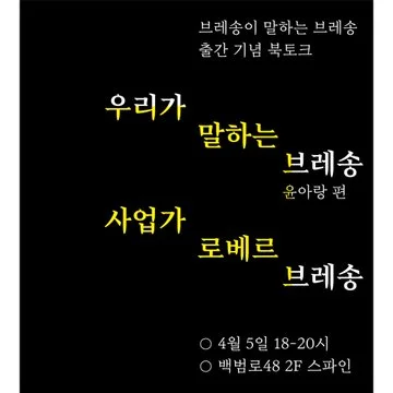 "초월적인 영화 혹은 완벽주의적 예술관같이 알려진 말 만으로는 붙잡을 수 없는, 브레송의 사업가적 면모를 이야기하는 시간을 준비했습니다. 브레송은 뛰어난 시네아스트이자 뛰어난 영화이론가인 동시에 영화 장사에 있어서도 아주 흥미로운 영역을 개척한 사람입니다. 예산과 필름을 확보하는 방법, 소규모 영화를 지속적으로 만드는 방법, 영화를 홍보하는 방법 같은 지점을 다룸으로서 이 시대 소규모 생산자-창작자인 우리들의 현실적인 생활에도 책의 도움을 받아보고자 합니다."