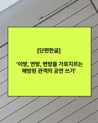 서울변방연극제에선 23023년부터 연극제 기간에 맞춰 관객 비평 프로그램 <단편한글>을 운영한다. <단편한글>은 "비평과 축제의 만남이 공연의 순간에만 머무는 것에서 확장해 보다 긴밀하게 연결되기를 바라며" 다양한 지역, 연령, 관심사의 필진들을 모집해 스터디를 기획 및 진행해왔다 하며, 내게는 여기서 연속 특강의 한 꼭지를 맡아달라는 요청을 해왔다. 올해 <단편한글>의 표제는 “이방, 연방, 변방을 가로지르는 해방된 관객의 공연 쓰기”였는데, 이에 맞춰 나의 "경계를 넘는 쓰기"와 이를 통한 동시대 문화에의 탐구 방법에 대해 얘기를 해달라는 것이었다. 아직 연극에 대해선 제대로 된 글을 써본 적이 없는지라, 내게 이 요청은 어둠 속에서 코를 잡힌 듯이 당황스러우면서도 감사한 제안으로 느껴졌다.