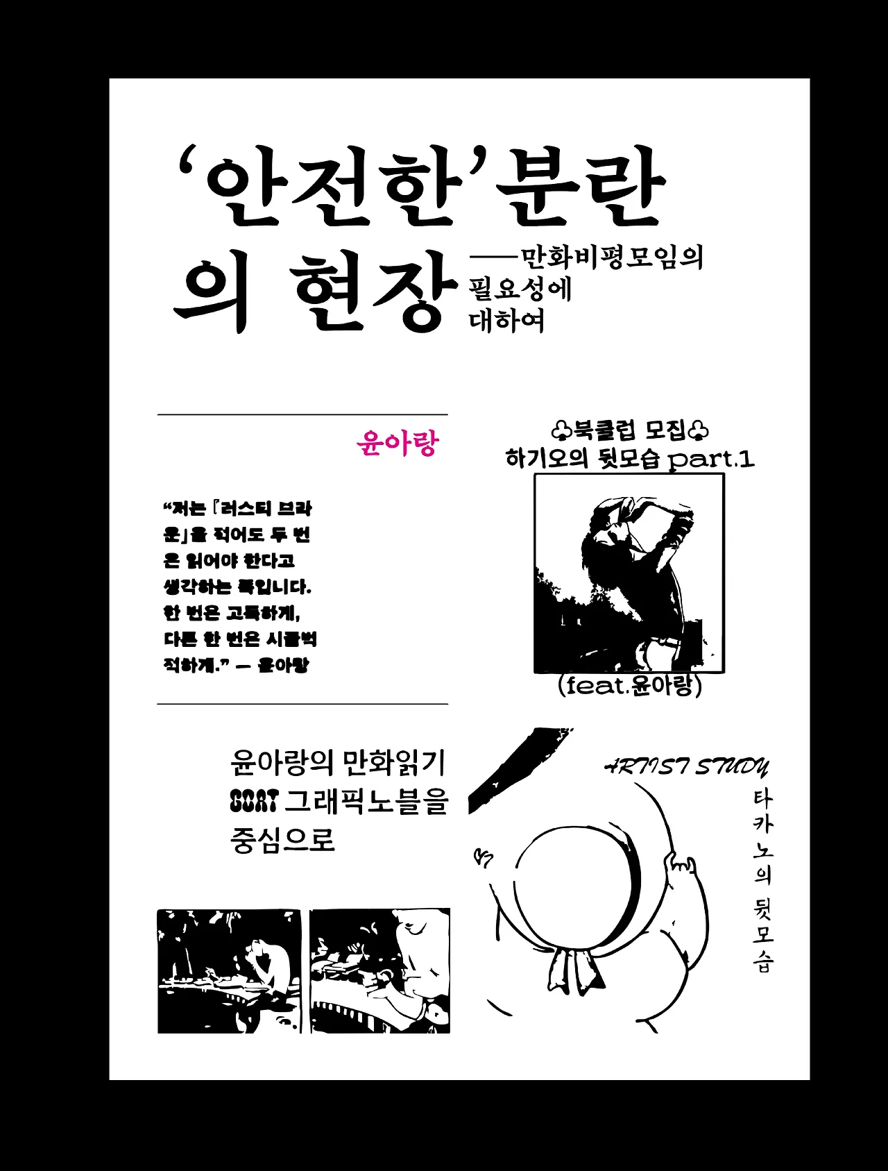 "필자로서 무엇을 쓰고 싶다는 욕구 대신 무엇을 쓰면 안 된다는 자제가 먼저 필요한 글이 종종 있다. 12.3 비상계엄/쿠데타에 대해 쓴다면 '윤석열과 그 잡배들을 마냥 욕하고 그 반대편의 응원봉과 '말벌 동지'들을 찬양만 해선 안 된다'라는 의지가, AI와 예술에 대해 쓴다면 'AI가 새롭다 혹은 새롭지 않다란 결론을 섣불리 내려선 안 된다'라는 의지가 필요한 것처럼 말이다. 특정 공동체의 '상식'에 호소하며 쉽고 빠른 결론으로 향하려는 태도, 즉 진부한 보신주의를 멀리하기 위해서는 저런 자제를 쭉 견지해야 한다. 그리고 당신이 읽고 있는 이 글 역시 내게는 그런 경우에 속한다. 화이트 리버 측이 이 지면을 위해 의뢰한 것은, 내가 출판사 쪽프레스와 함께 기획 및 진행 중인 일종의 북클럽 '만화비평모임'에 대한 글이었다."