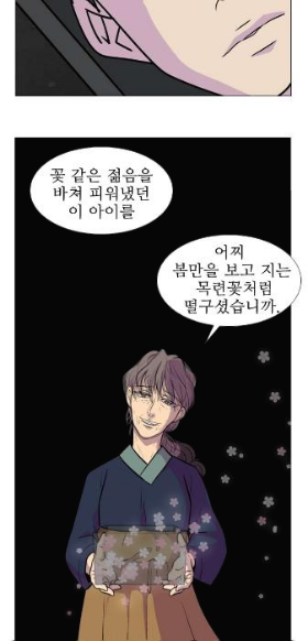 그리고 모션이 만화 안으로 들어오자 이 제한은 더욱 엄격하고 견고해졌다. 앞서 무빙툰으로서의 <가담항설>이 “칸이라는 구조의 근본을 건드리는” 작품이라고 썼는데, 이는 지속을 가능케 하는 기능을 칸에 부여한 것에 대한 말이다. 지속이라니? 복수의 컷을 하나의 칸 안에 중첩/압축시키는 –이는 방식에 있어 디졸브와 교차로 나뉜다- 효과로서의 지속. 하나의 칸에 보다 오랫동안 시선을 집중하게끔 하는 것은 물론 기호의 변화를 시간적으로 느끼게끔 한다는 점에서 이를 지속이라 불러도 큰 무리는 없을 것이다. 예컨대 36화에서 아들의 목을 든 홍화의 시어머니의 모습 위에 목련꽃을 손에 가득 담은 과거의 모습이 스크롤에 따라 조금씩 덮어씌워질 때, 그것은 아들의 죽음을 애도하면서 아들을 키운 자신의 젊은 날을 '함께' 애도하기 위한 디졸브로 다양한 시간성을 느끼게 한다. 혹은 38화에서 칸을 다 내리지 않았을 때엔 남아있던 결계가 스크롤을 조금 움직이자마자 갑자기 지워져 홍화가 곧장 추국에게 주먹을 날리는 충격적인 교차의 순간은 앞서 말한 지속의 명확한 사례이다. 그런데 여기서 내가 주목하고자 하는 건 이러한 지속들이 작품이 다루는 이야기에 있어 얼마나 효과적인 표현 방식이냐가 아니다. 근대 이후로 만화는 시간의 흐름을 찰나의 칸에 박제함에 따라 생겨난 복수의 시간의 중첩(말풍선에 부여되는 순서)을 드러내는, 지극히 기괴한 시간성의 예술 매체였다. 그런데 웹툰이 수직 스크롤을 보편적인 형식으로 삼고 <가담항설>에서 패럴랙스 효과가 칸의 지속과 긴밀한 관계를 맺게 되면서 이 시간성은 중첩/압축된 컷이 제시되는 순서를 직접적으로 지니게 되어 제한되고 순화된다. 그러니까, 굉장히 역설적인 상황이지만, 종종 칸의 구조를 기괴하게 비트는 무빙툰 효과는 그럼으로서 근대 이후 지속되었던 만화의 기괴함을 점차 지우는 것이다. 이야기의 특정한 흐름을 독자가 순서대로 마주치길 거의 강요한다는 점에서 여기엔 어떤 외설적인 면모마저 느껴진다.