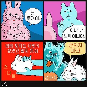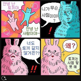 물론 당신은 반문할 것이다. 그게 어떻게 '미끄러진다'에 조응한다는 것인가? 거기서 실패나 의미의 굴절이 다뤄지고 있단 말인가? 그러한 변화 따위는 "아무도 모르"는 채 만화를 태연히 잘 살아가고 있지 않은가? 그러나 여기서의 미끄러짐이란 앞서 열거한 것들-말과 제스쳐의 미끄러짐이 아닌, 더 크고 은밀한 영역에서의 미끄러짐이다. 인물이 각 컷에서 취하는 감정에 따라 컷의 배경색이 바뀌긴 하지만 -가령 <토끼>에서 두 인물이 느끼는 놀람("!", "!!")의 감정은 동일하게 검은색으로 표현된다- 그 바뀐 색이 지닌 알레고리는 사실은 조금도 중요치 않다.1* ooo는 컷으로 분리된 세계를 그럴듯하게 마름질해야할 배경색을 고정시키거나 일시적인 감정 표현 효과로 사용하는 대신 매 컷마다 구체적인 변화의 과정을 과감히 생략한 채 변화하여, 배열된 컷들 사이에 잠재된 모종의 정합성을 깨트리고 그 차이의 관계를 강조한다. 다시 말해, 하나의 작품 안에서 일어나는 표면의 끝없는 비약적 변이에 우리는 주목해야 하는 것이다. 그것은 그 생략된 과정을 외려 강력하게 지시하며 우리에게 제시된 4컷의 이미지를 부조리하게 만들고 있다. 그런데 이 때의 부조리는 무엇을 향하는가? 바로 (마르쿠스 가브리엘식으로 말하자면) 세계의 비존재다.