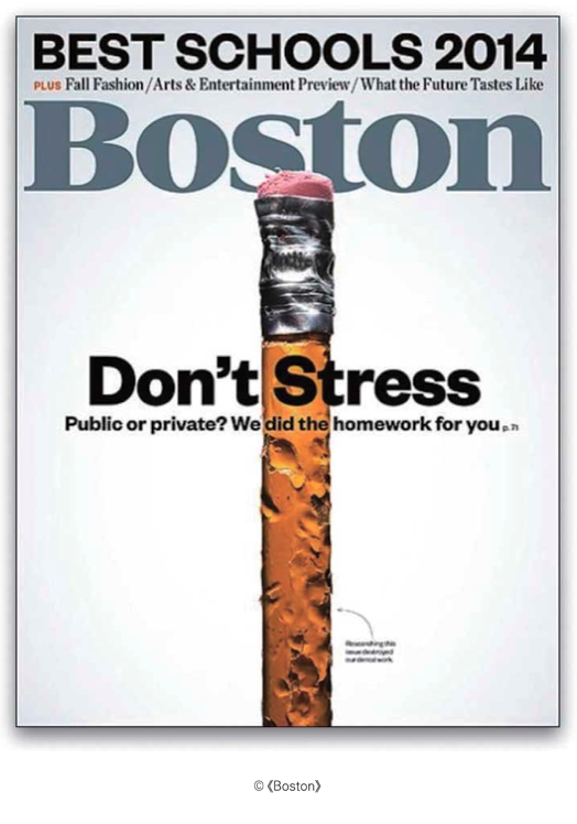 《보스턴》매거진 2014년 9월호의 표제는 "Don't Stress"다. 스트레스라는 주제를 시각화하기 위해 편집자와 아트디렉터는 연상 그물망을 펼쳤을 것이다. 다양한 연상어 중 '연필 잘근잘근 씹기'가 떠올랐을 것이고, 씹힌 연필만 보여줘도 독자가'스트레스'라는 핵심 메시지를 이해할 것이라 판단했을 것이다. 메시지와 비주얼 요소 사이의 거리가 너무 좁지도, 너무 멀지도 않아 보편적이면서도 위트가 살짝 느껴진다.