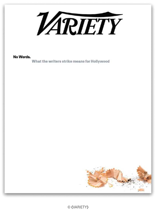 《버라이어티》2023년 5월 표지는 여백이 가장 큰 비주얼 재료다. 표제 문장을 보자. "No Words. What the writers strike means for Hollywood" 미국 할리우드 작가 9,000여 명이 파업에 들어간 소식을 심도 있게 전하는 호였다. '작가 파업'이라는 주제어를 시각화하기 위해 역시 편집자와 아트디렉터는 연상 그물망을 펼쳤을 것이다. 작가의 작업 도구인 연필을 재료로 사용했지만, 글씨를 쓰는 장면 대신 연필을 깎고 남은 흔적을 보여준다. 표제인 "No Words"와 결합해 메시지가 수면 아래로 흐른다. '작가는 열심히 일할 준비를 했는데, 아무 단어도 쓰지 않았다'. 평소보다 표제 서체 크기를 확 줄여서 여백을 강조했다. 여백은 침묵을 시각화하고, 이야기하는 사람들의 침묵은 파업을 연상시킨다.