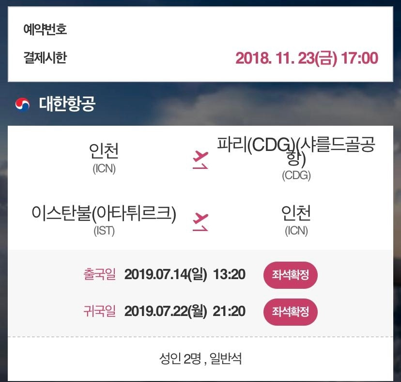 1) 이동수단 : 대한항공 인천-파리, 이스탄불-인천 간 항공료 2,276,000원 / 모닝캄 짐 2개 가능 총 4개