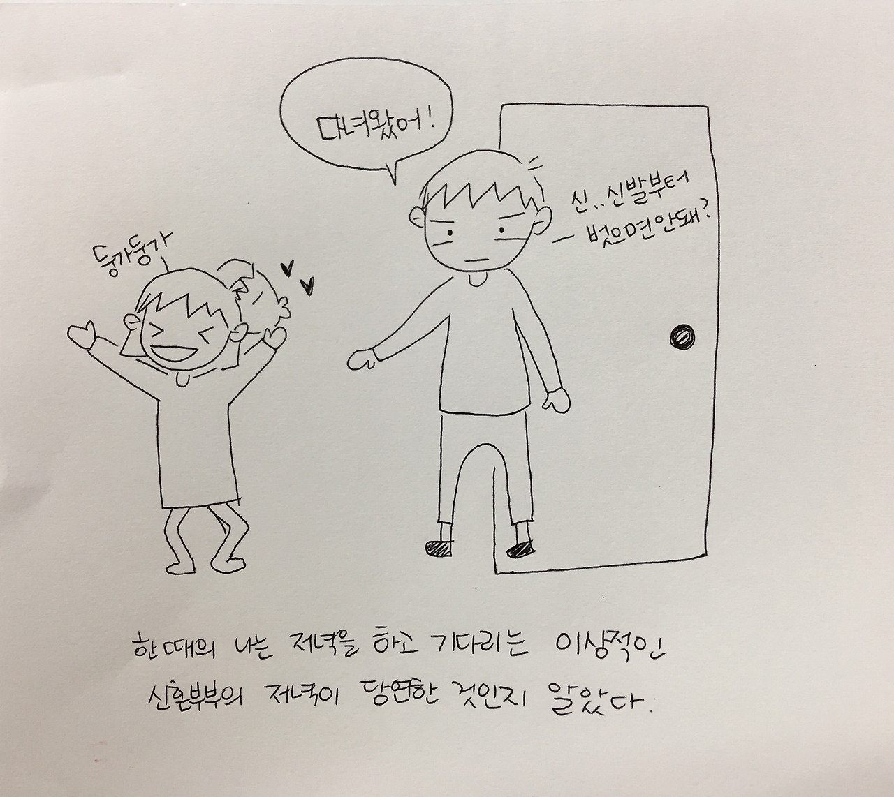 결국 나는 상처받지 않기 위해 기대를 내려놓기로 했다. 그 기대라는 것은 그가 일찍 집에 돌아오리라는 것 그리고 함께 저녁을 먹는 일상을 말하는 것이었다. 유년시절, 정해진 일과처럼 10여년 간 7시에 퇴근에 7시 20분에 집에 돌아와 저녁을 먹으며 '식구'라는 개념을 몸소 깨우치던 시간들이 있었기에 혼자인 시간이 유독 외롭고 서글펐던 것이라고 나는 스스로를 위로했다. 그는 저녁을 하고 기다리는 나에 대한 미안함을 덜었고 나는 외로운 시간 대신 요가를 하며 저녁 시간을 스스로 보내는 것을 선택했다. 살아온 환경이 다름을 인정하고 우리에게 직면한 현실에 맞춰 살아가는 것 그것은 결혼을 하고 우리가 가장 먼저 마주하게 된 숙제였다.