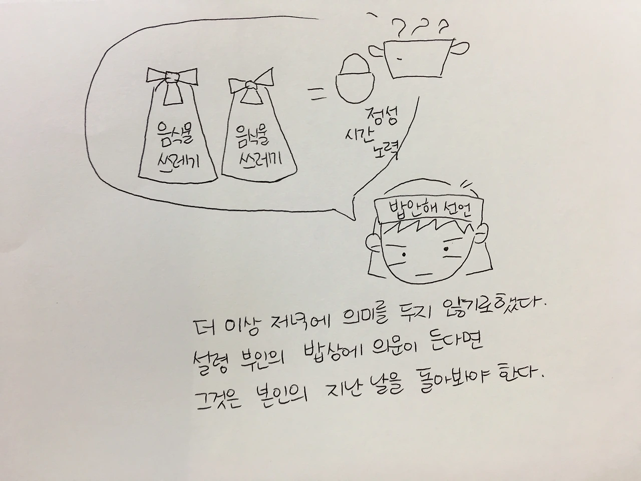 아침을 먹지 않는 그였기에 다음 날도 또 그 다음 날도 음식은 냉장고에 있다 버려지는 날이 많았다.