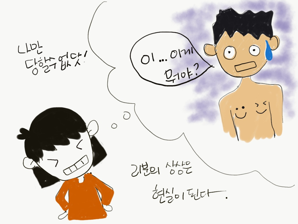 짜증과 분노를 웃음으로 승화시키기 위해 평소에 눈여겨 보았던 그의 가슴털을 면도기로 깔끔하게 깎고 덤으로 웃고 있는 스마일들을 가슴 양쪽에 예쁘게 그려넣어 주었다. 그가 즐거워 하는(?) 상상만으로도 새벽 3시 반까지 잠 못든 나의 애환이 스르르 사라지는 것만 같았다. 결국 우리는 그 누구도 화나지 않은 채로 다음 날을 맞이할 수 있었다.