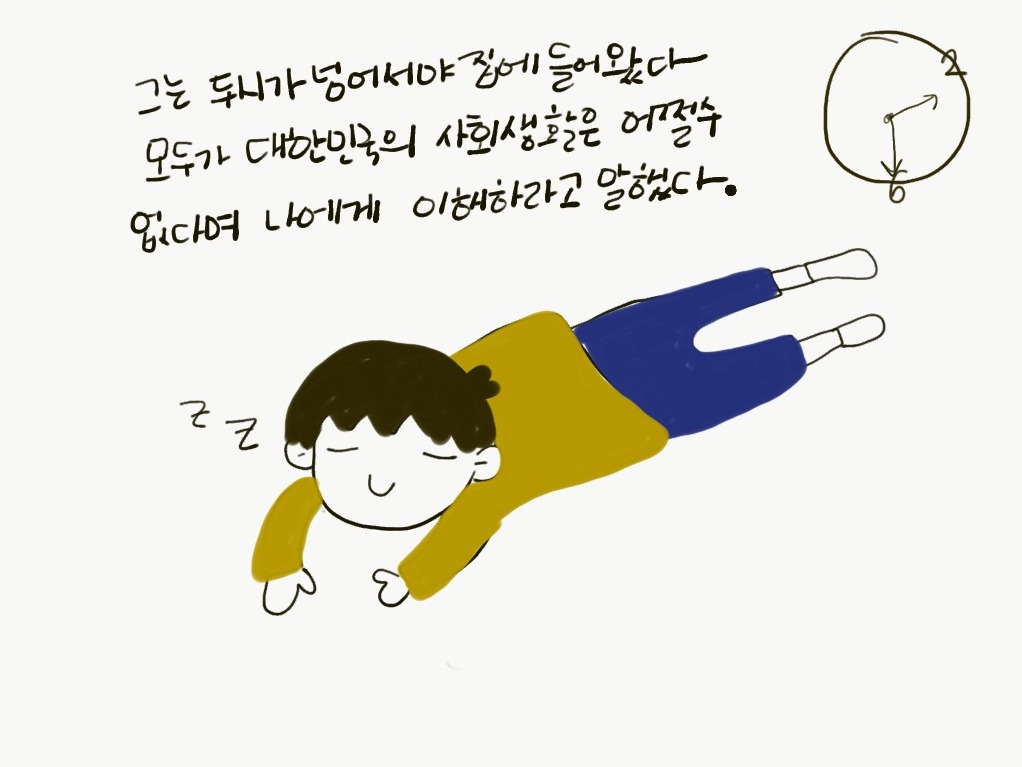 애처로운 표정으로 그의 머리를 몇 번 쓰다듬고 나면 어느 새 걱정과 애처로움을 잊어버릴만큼 신경을 긁는 코골이가 시작된다. 새벽 2시 반, 3시, 3시 반.. 오지 않는 잠 너머로 그의 끊이지 않는 코골이와 온 몸을 뒤척이는 소리 그리고 하염없이 흘러가는 시간이 느껴진다. 다음 날 출근을 해야한다는 사실이 나를 더 예민하게 만드는 것은 물론이었다.
