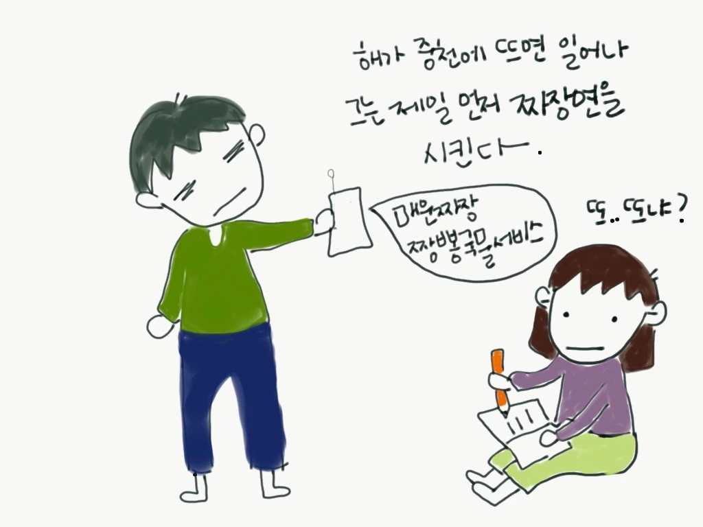 나와 전혀 다른 패턴의 가정에서 자란 그는 철저한 야행성이다. 그는 내가 모든 일들을 얼추 끝냈을 때야 비척거리며 일어나 한참을 뭉그적 거리고 마침내 몇 달간 철저한 입맛 인증으로 선택한 중국집에 전화를 건다. 그는 한치의 망설임도 없이 '매운 짜장과 짬뽕 국물 서비스'를 주문하고 하루를 시작한다.