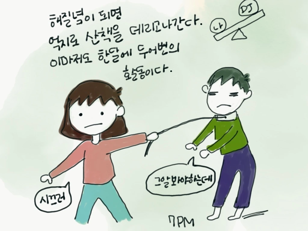 그가 TV에 빠져있을 때 넌지시 나는 하루의 마무리는 산책이 어떻겠냐는 제안을 한다. 대체적으로 그는 썩 내키지 않는 듯 하지만 내 눈치를 보며 억지로 옷을 입고 양말을 신곤 한다. 그래도 집 밖으로 나가면 그는 언제나