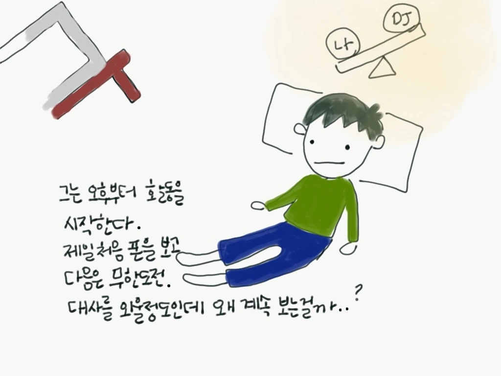 그가 제일 먼저 하는 일은 핸드폰으로 회사의 일을 살피는 것 그리고 두 번째는 무한도전 하이라이트 장면을 보거나 그것이 알고 싶다를 보는 일이다. 같은 일을 반복적으로 하는 것에 피곤과 권태를 잘 느끼는 나와는 달리 그는 몇 번이나 봐서 대화까지 외우는 무한도전 보는 일에 실증을 느끼지 않는 것만 같다.