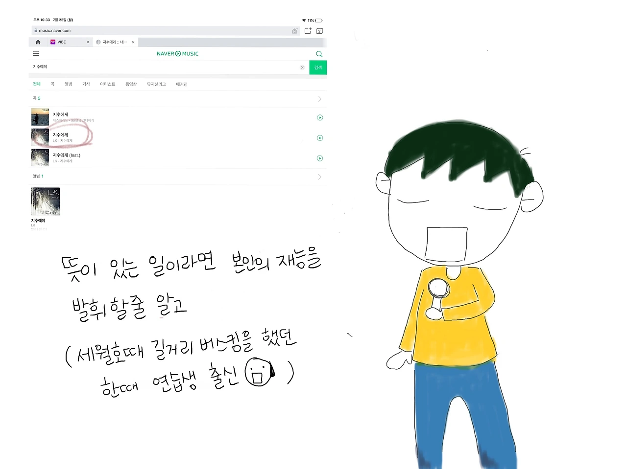 한참을 사귀다가 알게된 흥미로운 사실은, 그가 한 때 가수지망생이었다는 것이었으며 네이버에 검색을 하면 음원이 있는 (한때) 가수 이기도 했다는 것. ('LS - 지수에게' 를 검색해보세요) 그는 잊혀진 재능을 길거리 버스킹에서 뽐내곤 했다.