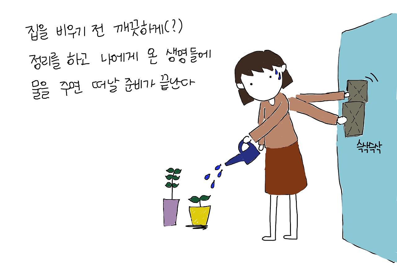 이미 출근해버린 그가 떠난 집에서 홀로 마지막 짐을 정리하고 집을 비운 동안 신경 쓰일 만한 것들을 정리하기 시작한다. 청소를 하고 올리브나무와 새로 싹이 튼 바질에 물을 주고 나면 얼추 떠날 준비가 끝난다. 아직 많은 것들을 책임지고 있지 않기에 떠나는 길이 그리 어렵지 않지만 그 언젠가 더 많은 것들을 책임져야 하는 시기가 올 때면 얼마나 무거운 발걸음으로 집을 나서게 될지를 이따금 생각하게 된다.