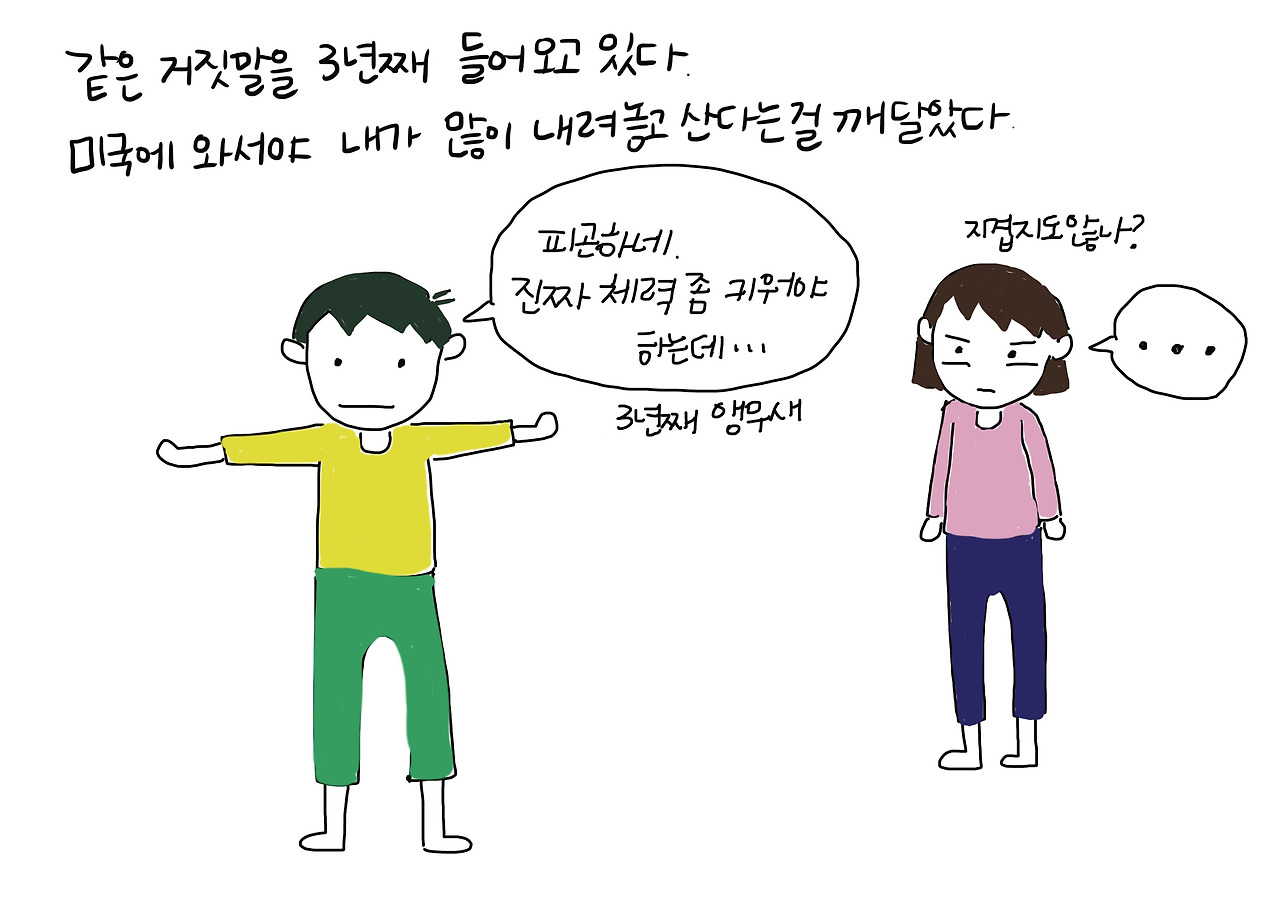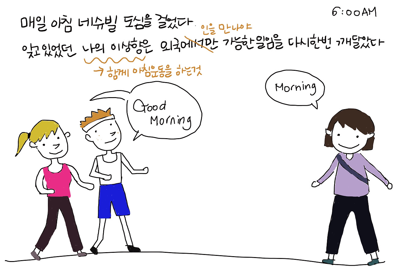 그러고 보니 집에 두고 온 그는 나와 함께 한 3년 동안 나와 함께 달리기를 해본 기억이 열 손가락에 꼽힐 정도였다. 운동을 하려면 장비가 필요하다는 둥, 옷이 없거나 운동화가 없다는 둥의 핑계가 지나자 이젠 ‘일’이라는 핑계 카드를 가지고 돌아왔다. 매일 아침 네슈빌을 달리며 밝게 웃는 사람들 속에서 내 결혼생활은 꿈꾸던 이상적인 모습과 꽤나 달라있다는 생각을 했다.