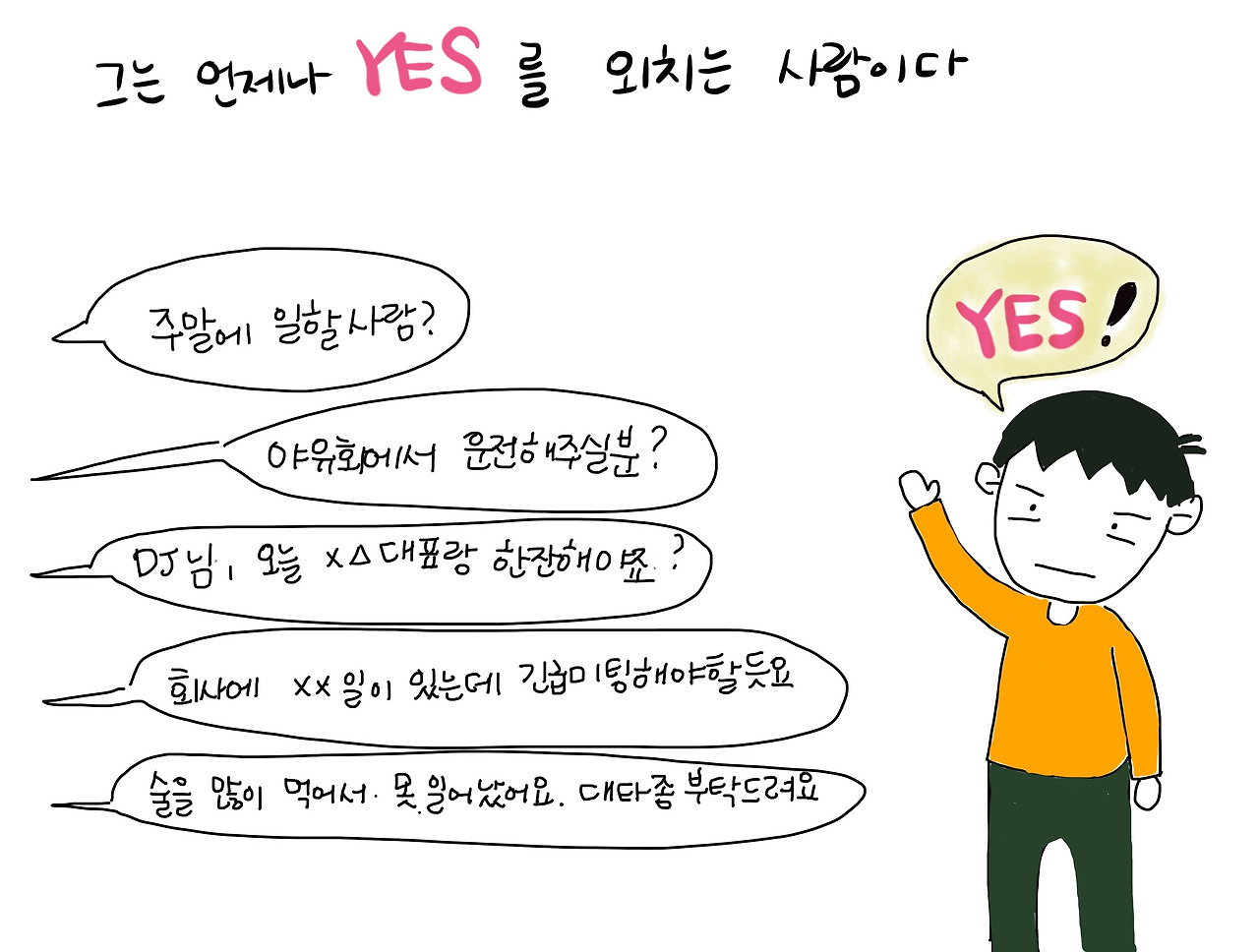 그는 언제나 YES를 외치는 사람. 그 덕분에 회사에서도 빨리 승진을 할 수 있었다고 언제나 이야기하곤 한다. 하지만 그 YES는 그의 주변인들에게 좋은 일이지 나에게는 그다지 좋은 범주의 것은 아니었다.
