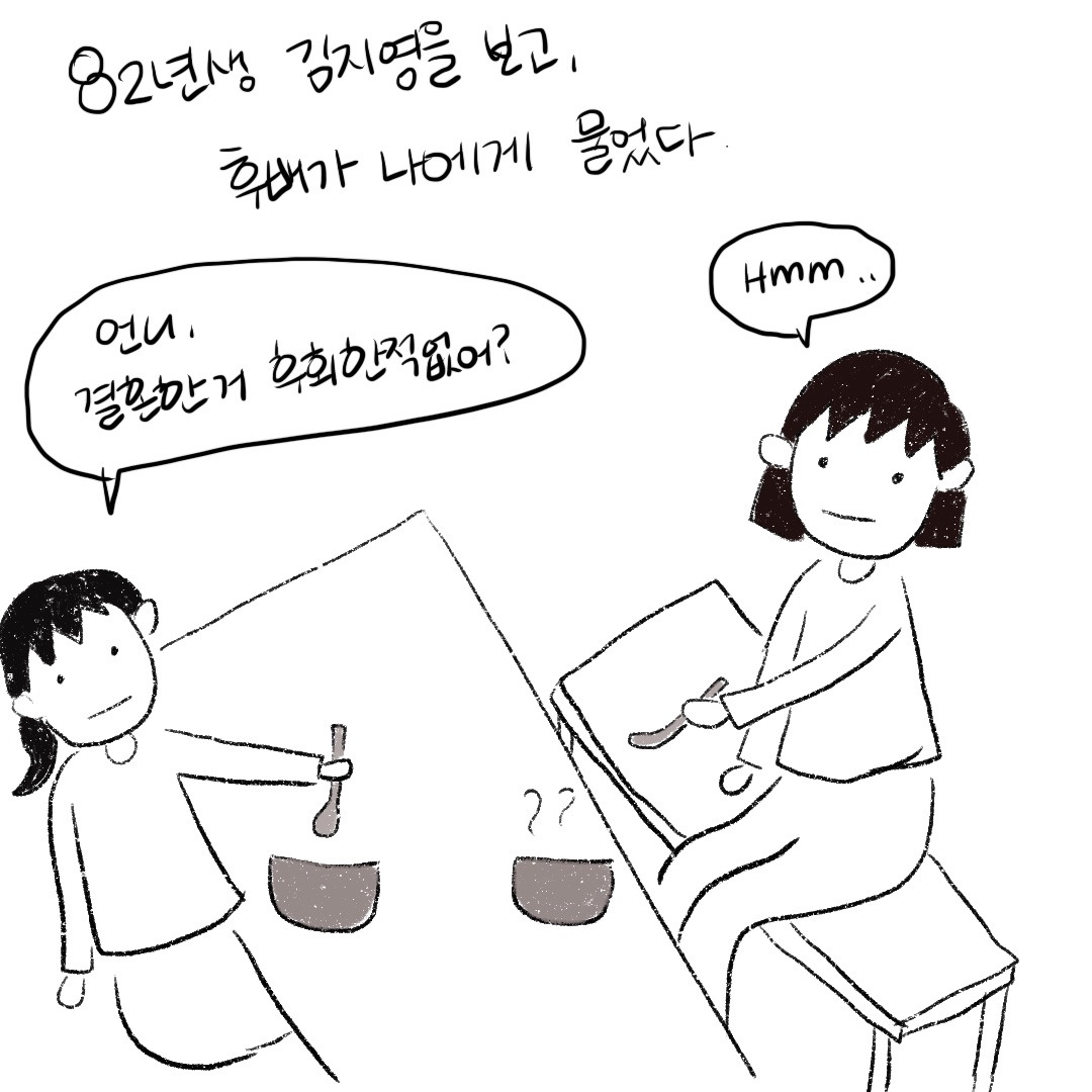둘 다 집안의 장녀였고 남동생이 있었기에 조금은 서로가 이해가 된 시간들. 할머니부터 엄마, 아빠까지 누구 하나 나를 딸이라고 과소평가하거나 소극적으로 키우시지 않았기에 나는 어린 시절부터 남동생과 동등하게 아니 어쩌면 더 많은 대우를 받고 자랐지만 내 앞에 앉은 동생은 그러지 못했다. 남동생에 대한 할머니의 편애와 집안 어른들이 던지는 말 속에서 자라는 동안 '김지영씨'와 비슷한 상처를 안고 살아온 것일 것이다. 시원하게 눈물을 흘리고 배가 고파진 우리는 해장국을 각각 한 그릇씩 앞에 두고 결혼에 대한 주제를 놓고 이야기를 하기 시작했다. 그리고 동생은 내게 문득 물었다.