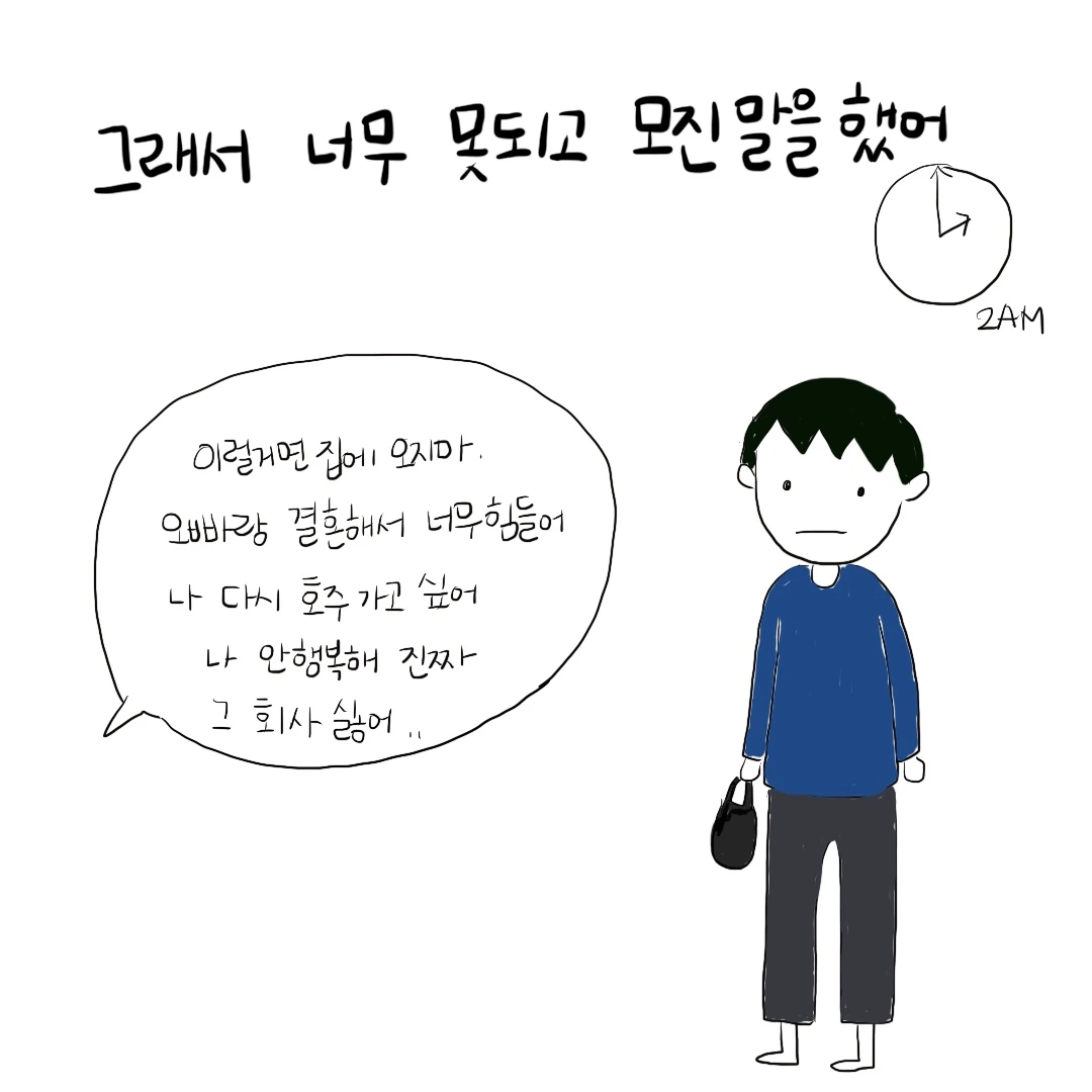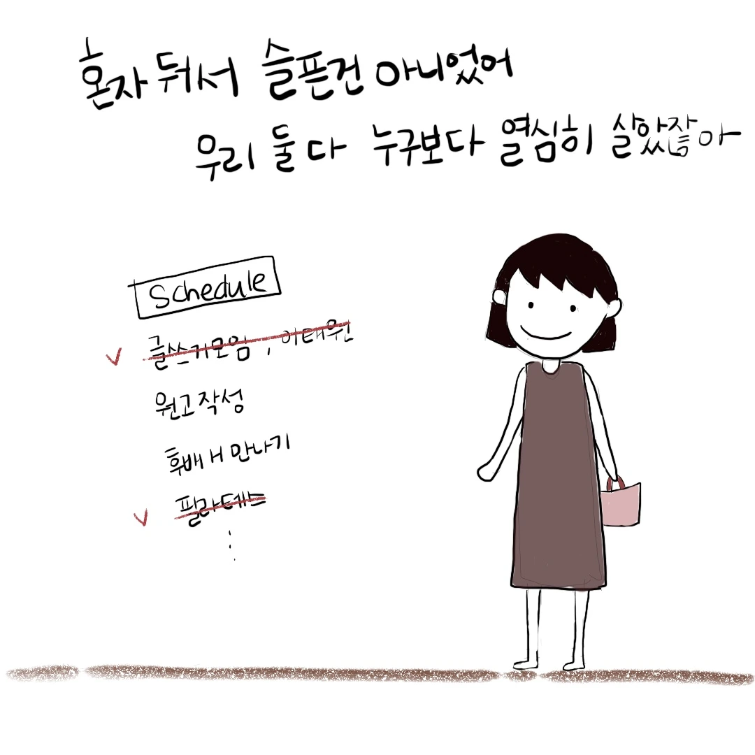 열심히 살면 좋은 날이 올거라고 생각했는데 생각보다 빨리 인생의 어려움을 마주했다. 그간 남편의 회사를 떠나갔던 사람들이 했던 이야기를 곱씹어보면 언젠가는 이런 결과가 올거라는 것을 어렵지 않게 예상할 수 있었지만 생각보다 타격이 컸던 모양이다. 더 나은 대우를 받으며 더 좋은 곳에서 일을 할 수 있을텐데 그는 서울에서 처음 정착했던 공간에 대한 애착이 유난히 컸다. 사람들에게 마음을 내어주는 것만큼 상처받기가 쉽다는 것을 잘 알지만 생각보다 냉정하게 사는 일이 유독 어려운 사람들이 있다. 내가 그랬고 또 그가 그래서 우리는 결국 결혼하게 된 것이었다. 다행인지는 모르겠지만 나는 5번의 이직 끝에 상처받을만큼 누군가와 친해지는 일을 경계하게 되었지만 그는 여전히 그 것이 어려운 모양이었다. 속상한 마음에 술을 먹고 그에게 상처를 주고 말았다. 내내 속앓이를 하던 말들을 쏟아내자 마음이 후련했지만 동시에 미안함이 그 공간을 메웠다.