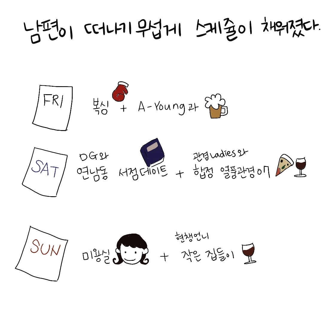 혼자 있을 저의 걱정에 자주 전화를 하고 영상 통화를 시도하던 그였지만 집에 붙어있을 새 없이 바쁘게 돌아다니던 저는 뒤늦게 그의 부재중 전화를 발견하고 다시 전화를 걸곤 했습니다. (결혼을 해도 아이가 없으면 비혼과 다르지 않은 모습으로 살 수 있더군요) 신기하게도 그의 부재가 시작된 날부터 약속이 쉴새없이 잡힌 것은 우연의 일치가 아니었을까요. 그는 다소 삐진 눈치였지만 덕분에 하루 2번의 약속을 처리하며 외롭지 않은(?) 주말을 보내 수 있었습니다.