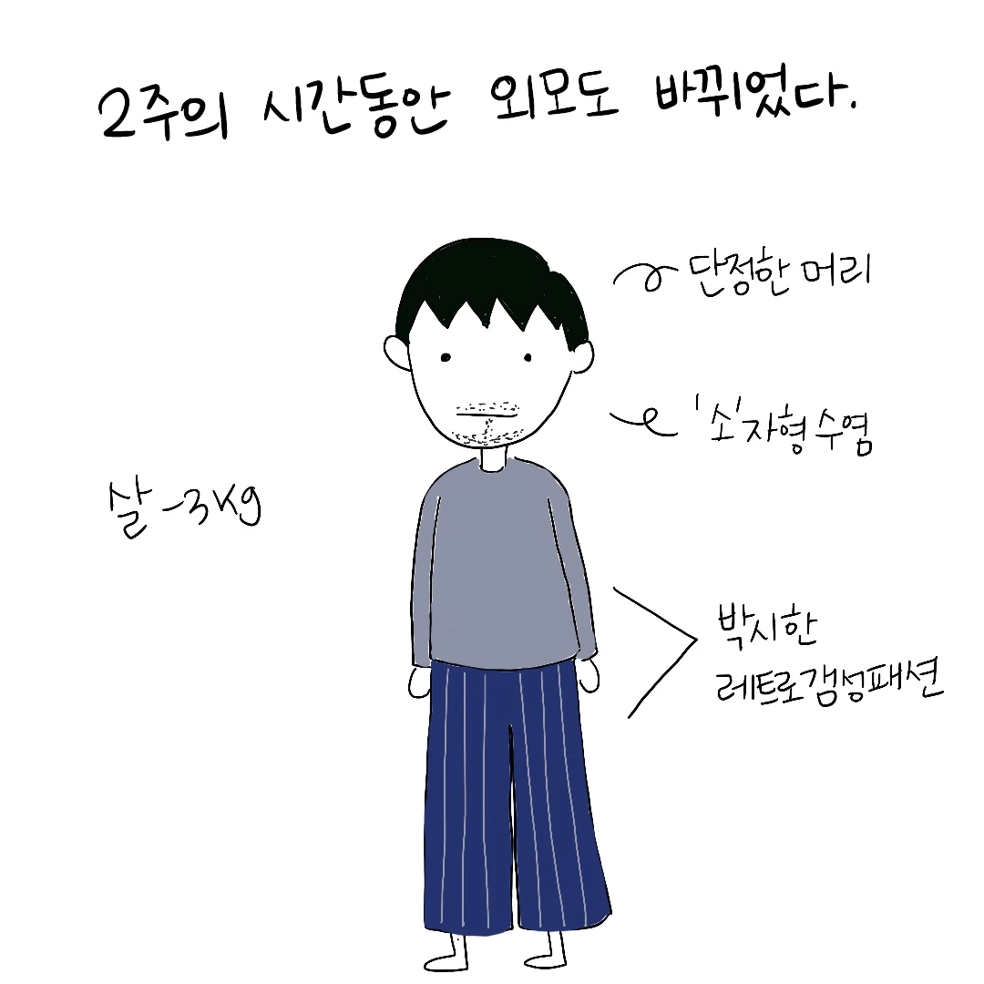 왕년에 외모에 관심이 많았다고 말하던 그는 요즘 다시 거울을 보기 시작한 모양입니다. 결혼 하기 전까진 옷에 대한 욕심이 없던 그는 최근 뒤늦은 옷춘기(?)를 맞이하여 수염을 기르고 레트로 스타일의 옷들을 하나 둘 구매하기 시작했거든요. 2주의 휴가 동안 스타일 변신을 시도하고 고향에 다녀오고 그야말로 새로운 사람이 되어 제 앞에 등장했습니다. 아직 레트로 스타일을 따라가기 버거운 저는 고개만 끄덕일 뿐입니다 (진심은 아직 탑재하지 못했어요)