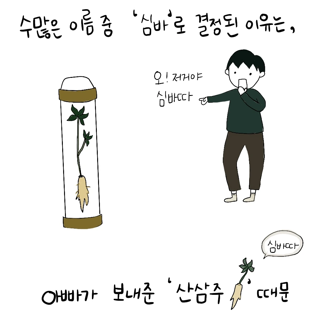 결국 이름 짓기에 어려움을 겪던 우리가 강아지의 이름을 심바라고 짓게 된 이유는 아빠가 직접 캐서 보내주신 산삼주를 먹으려고 열어보다 영감이 떠올랐기 때문이었습니다. 결국 저희 아부지께서 강아지 이름을 지어주신 것이 되었네요 (작명비를 준비해서 올 어버이날에 내려가야겠습니다 총총)