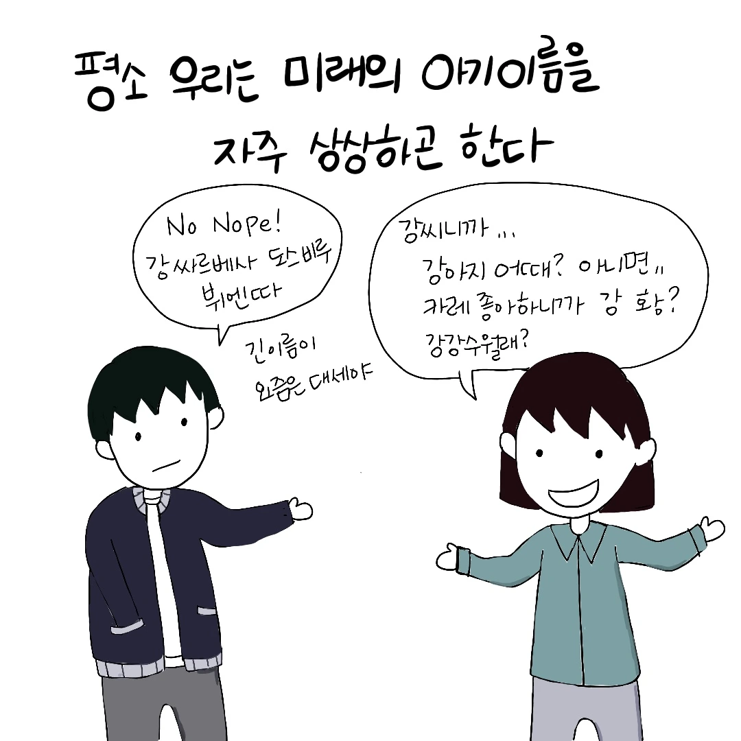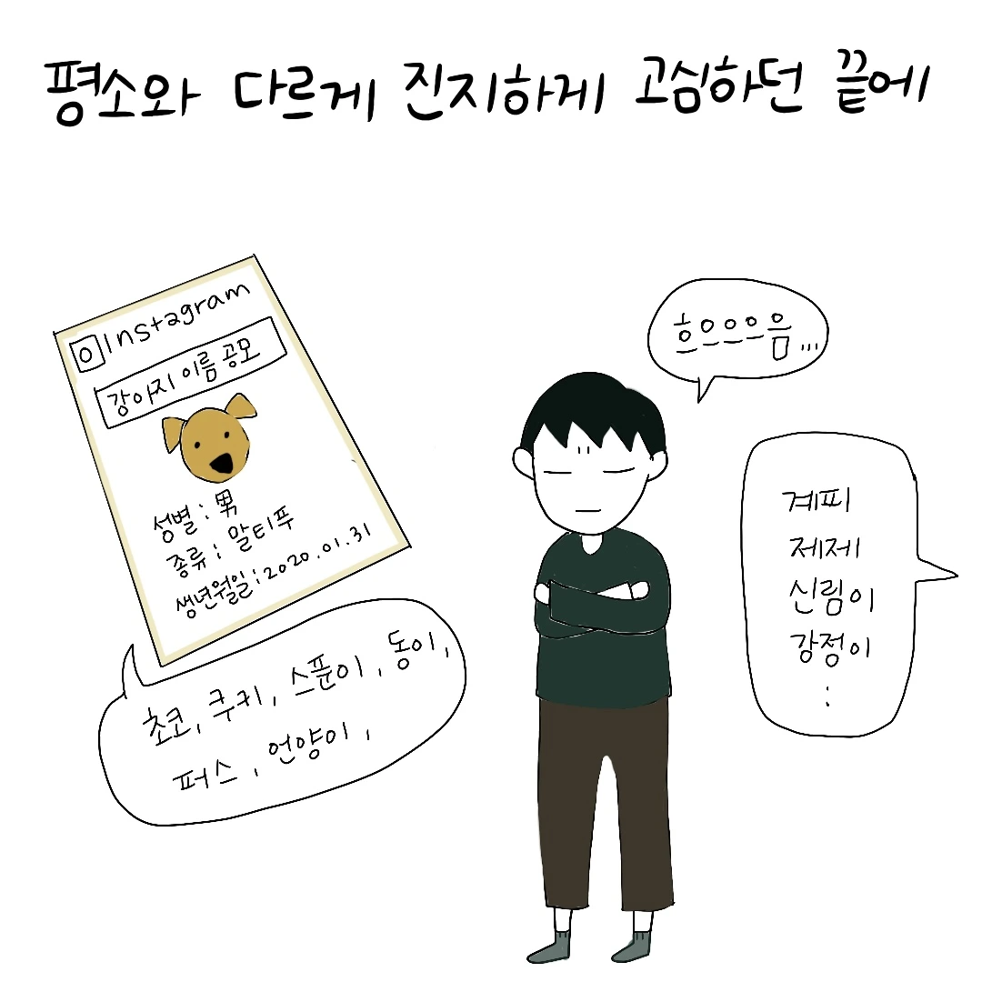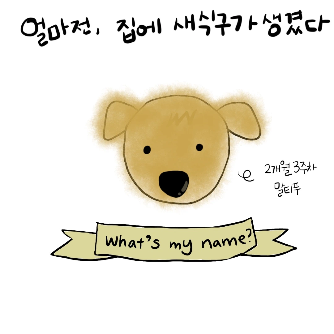 이름이 주는 힘을 믿으며 자라왔습니다. 저 역시도 꽤나 이름이 특이한 편이지만 남편도 그런 편이었기에 (마치 북에서 내려온 것 같다는 놀림을 받기도 합니다) 저희의 새 식구에게도 꽤 의미있고 유쾌한 이름을 지어주고 싶었습니다. 처음 아기 강아지를 데리고 온 날부터 3일이 다 되도록 이름을 한참동안 고심했습니다. 인스타그램에서 친구들에게 공모를 받았고 집으로 놀러온 친구들과 함께 토론하기도 했지만 결국 이름은 이렇게 정해지고 말았습니다.