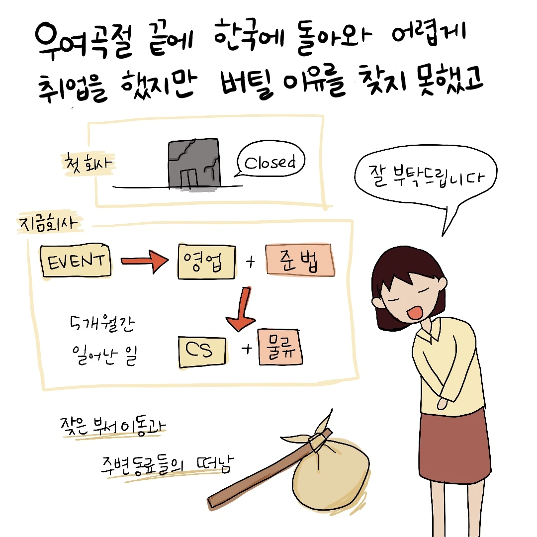 어렵게 마음을 다잡을 때마다 회사는 조직 개편과 해고를 이어갔고 지난 두 달 동안 많은 동료들이 권고사직을 받아 떠났습니다. 갑작스레 떠난 이들의 일까지 맡아 해나가면서 자꾸만 의미와 보람, 동료도 없는 일에 의문을 품게 되는 시간들이었습니다.