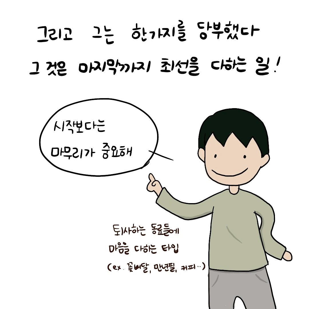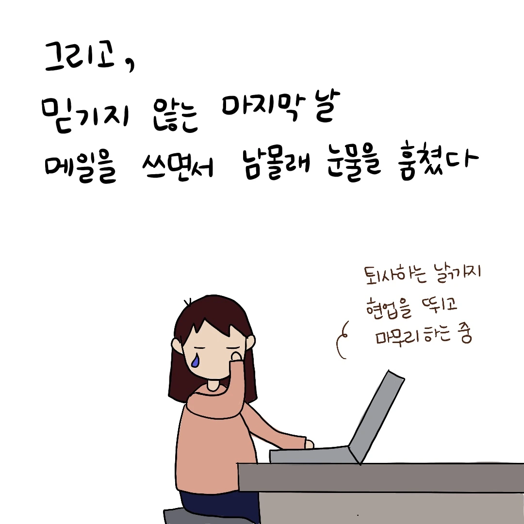 시작보다 끝이 중요하다는 남편의 말은 사실 누구나 다 할 수 있는 말이었지만 실천에 옮기기까지는 쉽지 않은 말이기도 했습니다. 회사를 마무리할 땐 좋은 감정보다 서글프고 서러운 감정이 앞서 그만두는 사람들이 더 많은 만큼 그 끝을 잘 마무리하기는 쉽지 않은 듯 보였습니다. 그래서 스스로가 어떻게 마무리를 해야될 지 한참이나 고민해야했지요.