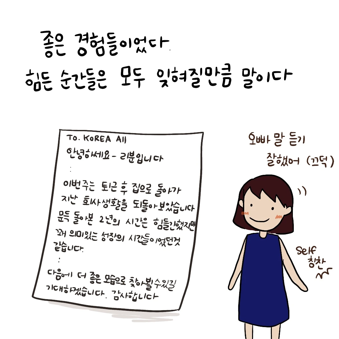 결국 결론은 '나답게 하자!' 그래서 마지막 떠나는 날은 사장님 방에 용감하게 들어가 사장님과 마지막 셀카까지 찍고 나올만큼 즐거운 마무리를 지었고, 회사의 모든 분들께 감사의 메일을 보내고서야 비로소 좋은 마무리를 했다는 생각이 들었습니다. 모든 사람들에게 좋은 사람일 수는 없지만 마무리를 잘 하는 사람이라면 사람들의 기억 속에 '괜찮은 친구'라는 인식을 심어줄 수 있지 않을까요?
