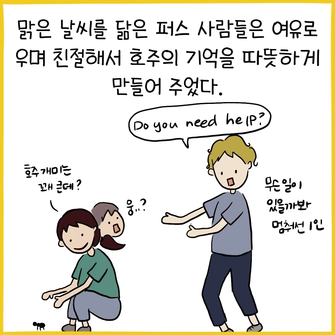 오후 4시면 대부분의 직장인들이 퇴근을 한다. 아이들은 엄마아빠의 퇴근길에 유치원에서 돌아와 함께 공원에서 시간을 보내고 저녁을 먹는다. 식당이나 상점들도 오후 9시 이후에는 대부분 문을 닫기 때문에 가족들끼리 시간을 함께 보내는 것이 너무도 당연한 문화이다. 가족 친화적인 환경에서 자란 사람들은 가족들과 대화를 나누며 가족 구성원으로서 자신이 얼마나 소중한 사람인지를 깨닫는다. 그렇게 어른이 된 사람들은 자신이 가진 것을 타인에게 나누거나 배려할 줄 알았고 그런 마음은 호주에 머물렀던 나에게도 자주 와 닿았다.