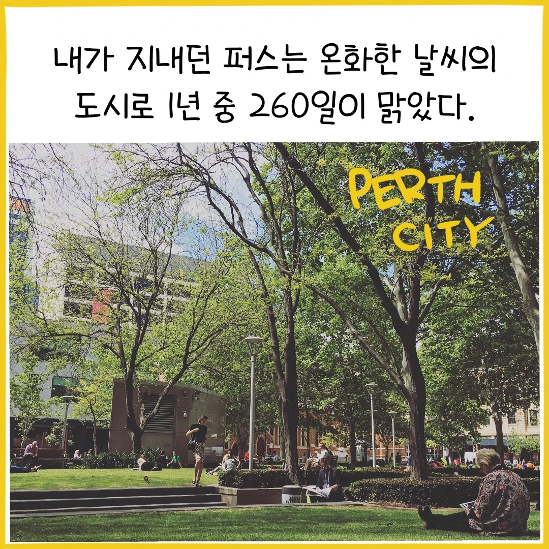 광활한 크기의 호주는 한 대륙 안에서도 다양한 기후와 자연 그리고 문화를 가지고 있는 나라이다. 내가 지냈던 서호주의 주요 도시인 퍼스는 호주의 대표 도시들 중 가장 고립되어 있는 도시이지만(실제로 사람들은 'isolated:고립된' 이라는 표현을 종종 쓰기도 했다) 영국인들이 은퇴 후 가장 살고 싶어 하는 도시로도 꼽힌다. 가장 큰 이유 중 하나는 이 곳의 맑고 화창한 날씨 때문인데 안개가 자주 끼는 영국의 날씨와는 달리 1년 중 약 260일 정도가 맑고 온화하다. 겨울에 비가 집중적으로 내리기 때문에 겨울을 제외한 날들은 푸릇한 잔디와 길게 뻗은 나무들 그리고 아름다운 일출과 일몰을 볼 수 있다.