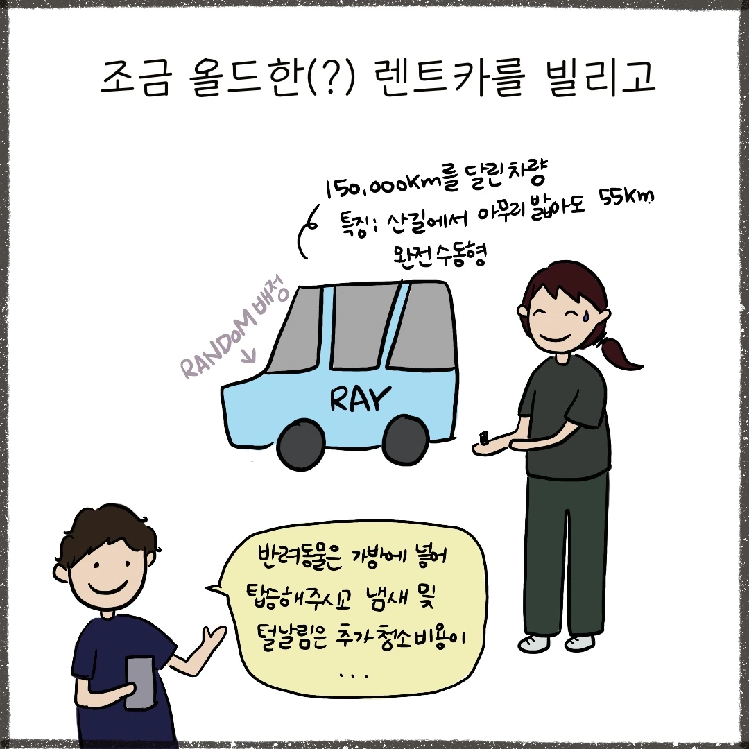 제주에 도착한 뒤에는 렌트카를 빌려야했는데 반려동물과 함께 탑승하는 경우에는 조금 더 가격대가 있는 렌트카를 대여해야 하고 오래된 차량을 받게 되기도 하더군요. 밟아도 앞으로 나아가지 않고 rpm만 올라가는 차를 보며 조금 답답했지만 그래도 심바와 제가 함께 탈 수 있음에 감사하며 여행을 했답니다. 동물과 함께 갈 수 없는 밥 집과 카페가 많아 차에서 김밥을 먹거나 커피를 마시는 일도 왕왕 있었지만 제가 머물던 서귀포 남원읍에는 생각보다 따뜻한 분들이 많아서 그 분들이 베풀어주신 친절에 지친 마음을 많이도 치유받고 온 것만 같았습니다. 집으로 돌아온 지 벌써 몇 일이 지났지만 여전히 파란 바다의 남원읍에 마음이 머물러 있는 것만 같더라구요.