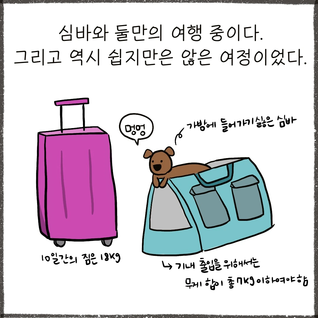 강아지를 키운 뒤 많은 제약이 있을 거라는 것은 조금은 예상했던 부분이지만 사실 상상 이상으로 엄청난 희생과 이해가 필요하다는 것을 느끼게 된 것만 같습니다. 비행기를 타고 가는 일부터가 쉽지 않은 일이었는데요, 기내에 함께 탑승하기 위해서는 가방와 강아지의 무게가 7kg을 넘지 않아야 한다는 것과 비행기 티켓을 예매하기 전 항공기에 함께 탑승할 수 있는지를 확인하는 것이 우선이었습니다. (항공사마다 다르지만 제가 탔던 항공사에서는 비행기 한 대당 총 3마리의 강아지가 탑승이 가능했습니다) 그리고 비행을 하는동안 가방에 얌전히 들어가있는 일이 심바에게는 최대의 미션이었지요! (무사히 잘 해내주었답니다...ㅠㅠ)