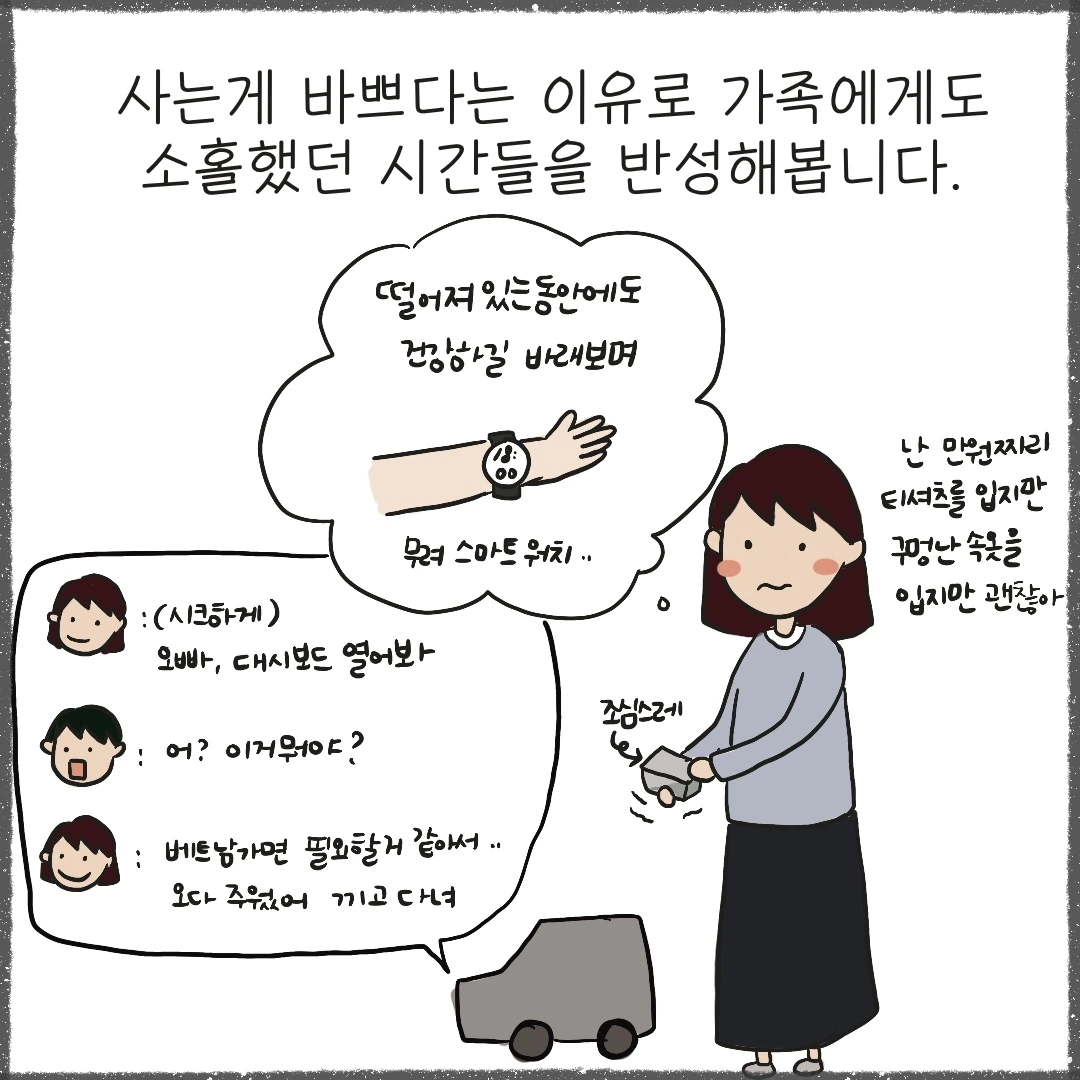 무슨 선물을 해주면 좋을까 몇 번을 고민하다가 멀리 떨어져 있어도 함께 시간을 보낸다는 의미로 시계를 선물해주기로 했습니다. 매번 같은 카시오 시계만 끼고 다니는 그에게는 미팅에서도 요긴하게 쓰이곤 하는 스마트워치가 제격일테니까요. 단 몇 달일테지만 보지 못하는 시간동안 서로가 조금은 더 성숙해져 있길 바라며. 서로가 씩씩하게 지낼 마음의 준비를 해봅니다.