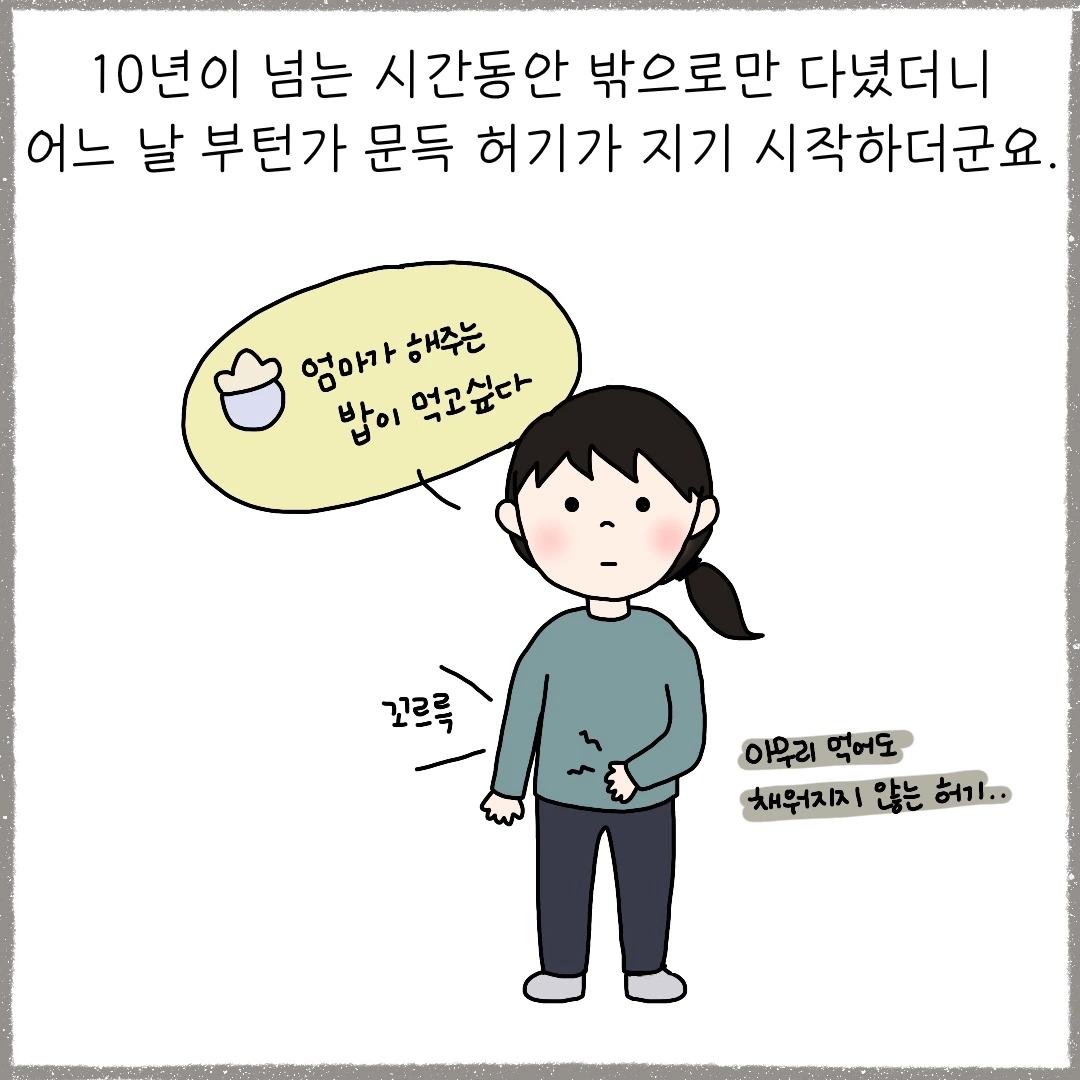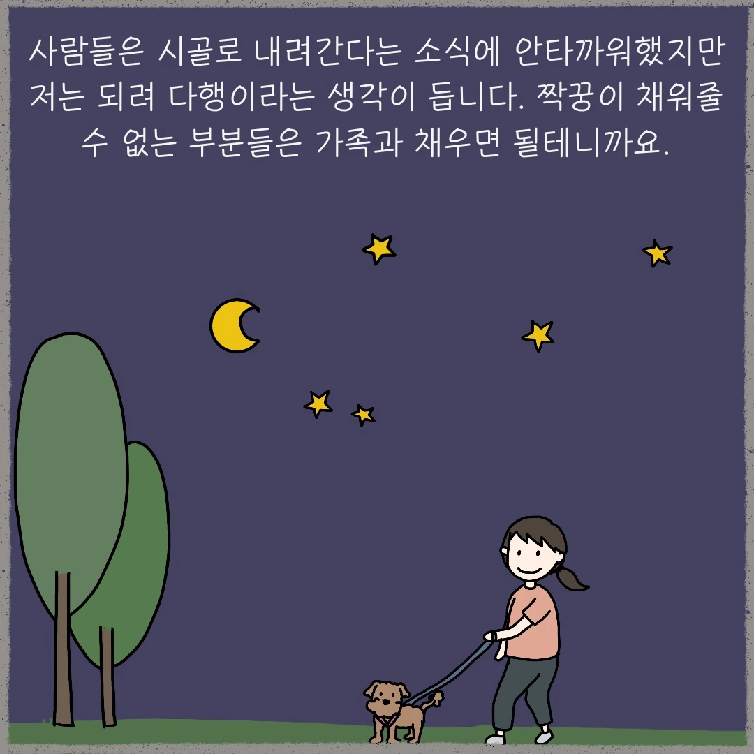 15박스나 되는 짐을 싸고 커다란 가구들을 당근 마켓으로 처분하고 용달 차량에 남은 전자제품들을 실어 고향으로 내려보내고 다시 4시간 30분을 달려 도착한 친정집. 엄마는 며칠 전부터 몇 시쯤 출발할 예정인지, 무엇이 먹고 싶은 지를 전화로 재차 확인하곤 했습니다. 집에 도착하자마자 엄마가 차려준 따뜻한 밥과 소고깃국을 입에 밀어 넣으니 비로소 허기가 채워지는 기분이 들더군요. 엄마가 차려주는 밥상은 어떤 모습이라 해도 마음을 따뜻하게 채워주는 마법 같은 능력이 있는 것도 같습니다. 여전히 시골에 적응 중이지만 서울에서보다 더 여유로워 보이는 심바와 산책길의 따스한 풍경들을 바라보니 저의 작은 숲은 변하지 않았다는 생각이 듭니다. 앞으로의 시간 동안 저는 어떤 숲을 가꾸며 지내게 될까요? 올해 써 내려갈 리틀 포레스트의 모습이 조금은 기대가 되는 바입니다.