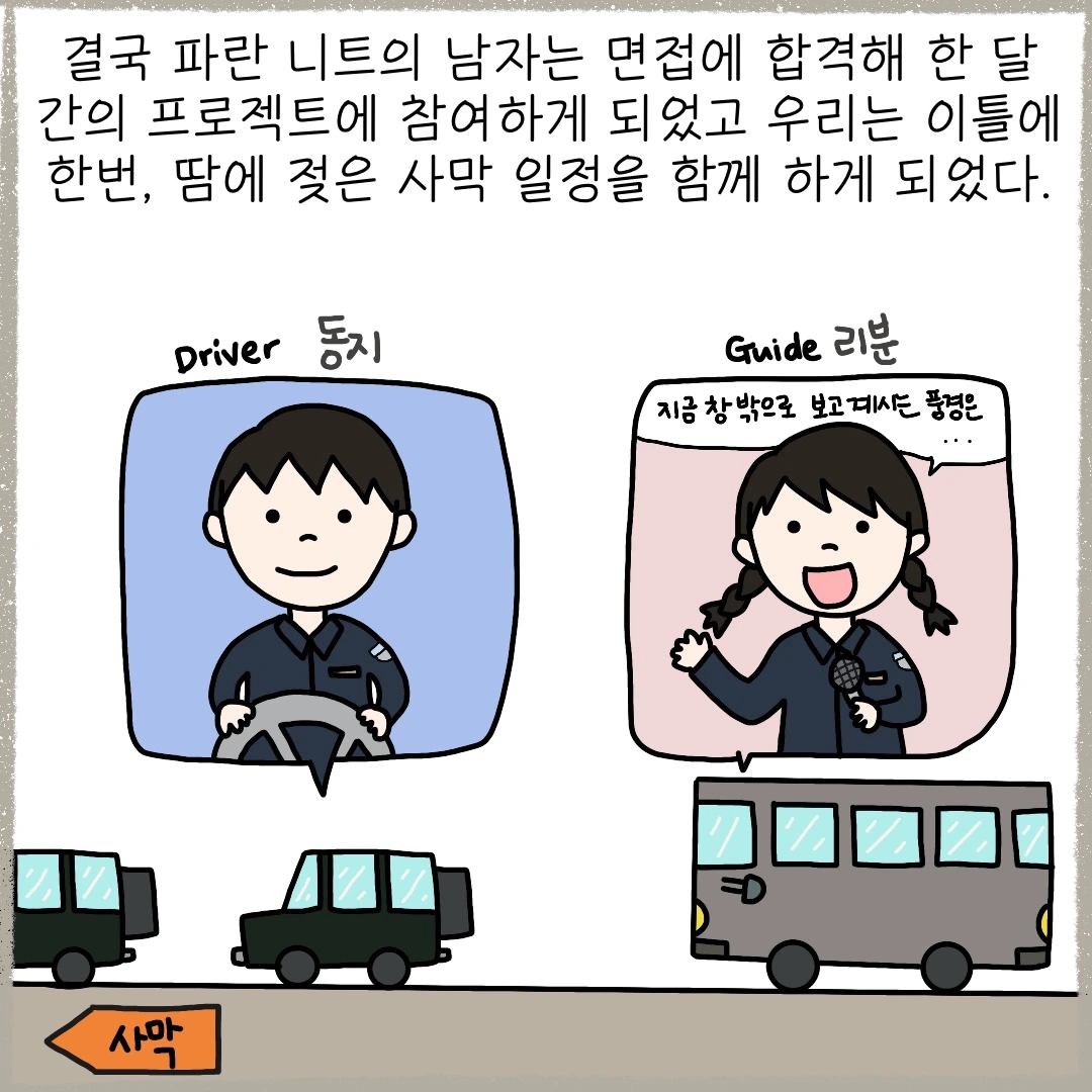 4년의 연애 공백이 있던 저는 사실 연애가 저와는 조금 동 떨어진 이야기라고 생각할 때가 많았습니다. 반듯하고 인간적인 그가 자꾸만 시선에 걸리던 순간들에서도 일을 하는 중에는 사적인 감정을 개입시키면 안 된다고 스스로를 타이르곤 했었지요. 그 당시 그에게는 여자 친구가 있기도 했거니와 말이에요. 한 달이라는 짧지도 길지도 않은 시간 동안 저는 이틀에 한 번씩 드라이버 분들과 함께 사막으로 향하곤 했습니다. 저는 중간 책임자이자 버스 인솔자 그리고 사막투어 가이드 역할을 함께 했기 때문에 거의 매 순간 뛰어다니느라 땀에 흠뻑 젖은 채였는데 나중에 들어보니 그는 땀냄새가 나도록 열심히 뛰어다니는 모습에 호감을 느꼈다고 하더라고요. (땀냄새가 맺어준 인연이란 말입니까 정녕!) 무튼, 운명은 생각지도 못한 상황에서 찾아오곤 한다는 걸 깨닫게 된 순간이었습니다. 아무쪼록 저는 운명을 믿는 편입니다. 제가 그를 만난 순간을 돌아보면 말이죠:)