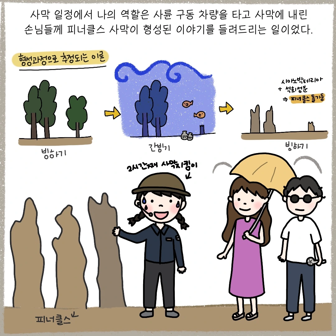 하루 350km를 달려야 하는 뜨겁고 힘든 사막 일정을 한 달간 해내며 우리 팀은 조금씩 가까워졌습니다. 몇 시간씩 그늘 하나 없는 사막에 서서 가이드를 하고 나머지 일정들을 소화하며 땀에 절은 저와 그런 저를 진심으로 챙겨주던 사람들 덕분이었습니다. 점점 더 혹독하고 뜨거워지는 스케줄이었지만 이틀에 한번 돌아오는 사막 일정을 저도 모르게 간절히 기다리고 있었습니다. 아마 그것이 제가 사랑에 빠진 신호가 아니었을까요.