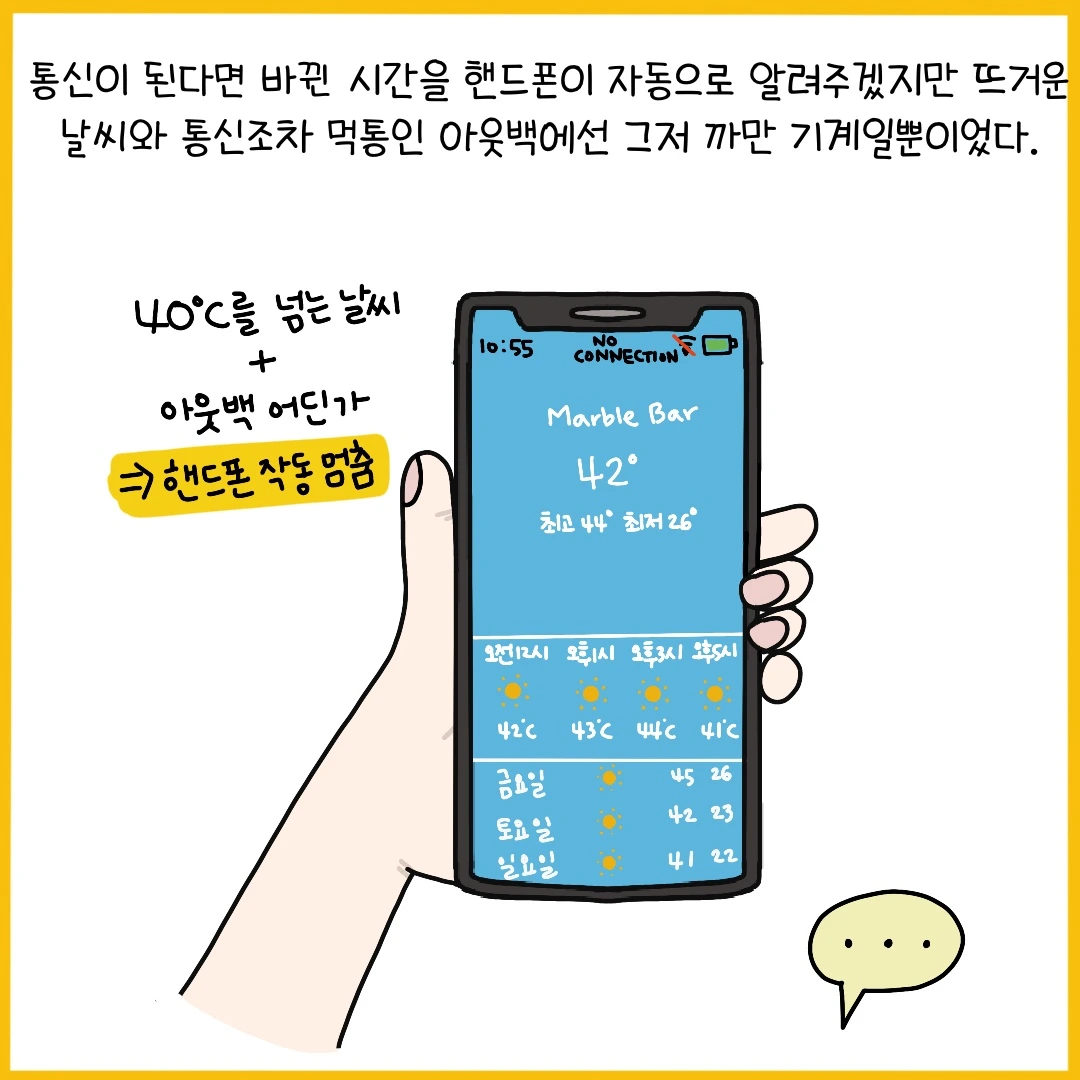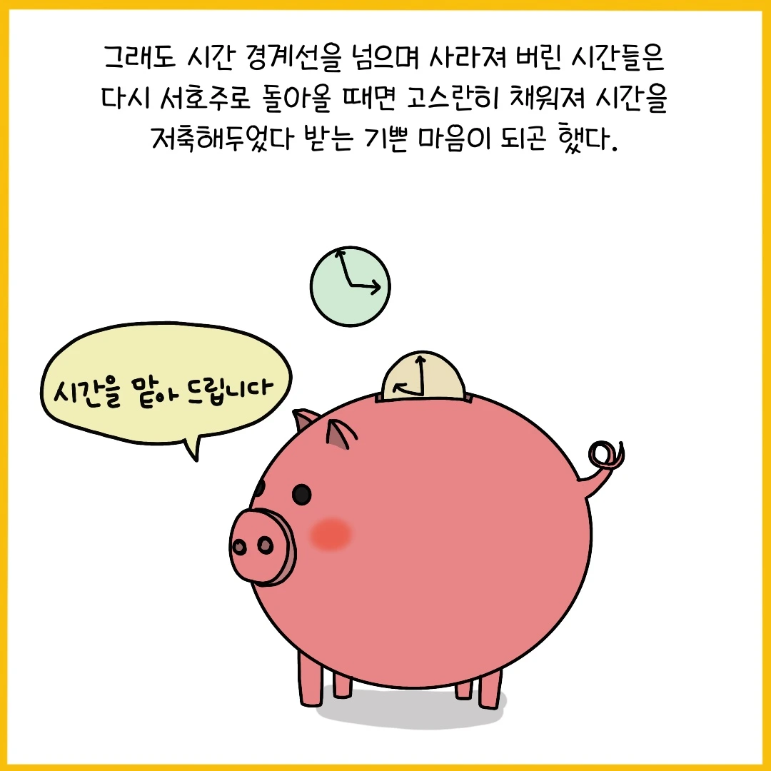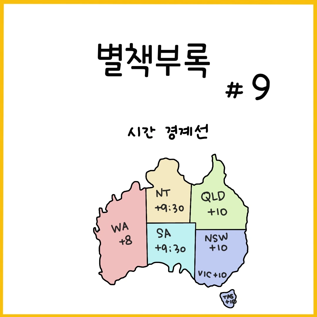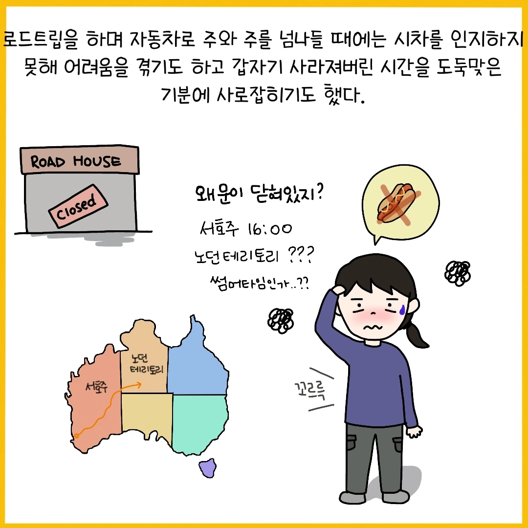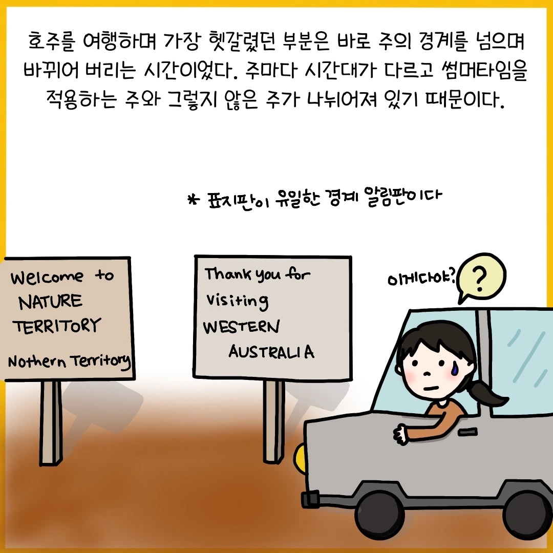 호주는 한반도의 무려 77배 크기. 작고 아담한 우리나라에선 모든 도시에서 같은 시간을 공유하지만 호주는 주마다 각기 다른 시간을 사용하고 있다. 거기다 서머타임까지 적용되는데 모든 주에서 서머타임을 시행하는 것이 아니라 수도인 캔버라가 있는 주를 비롯해 시드니가 있는 뉴사우스쉐일즈, 타즈매니아, 빅토리아, 남호주가 서머타임을 기준으로 시간이 다시 바뀐다. 비행기로 도시를 여행할 땐 핸드폰이 바뀐 시간을 자연스럽게 알려주곤 하지만 로드트립을 할 땐 통신이 원활하지 않아 시간이 어떻게 바뀌는지 계산하는데 한참이나 걸리곤 한다. 주를 넘어갈 때마다 순식간에 사라져 버린 시간이 가끔 너무 야속하기도 하지만 여행을 처음 떠난 자리로 돌아갈 때면 시간 경계선 어딘가에서 사라진 시간들을 다시 찾을 수 있다는 설렘이 호주를 여행할 때면 가장 먼저 떠오르곤 했다.