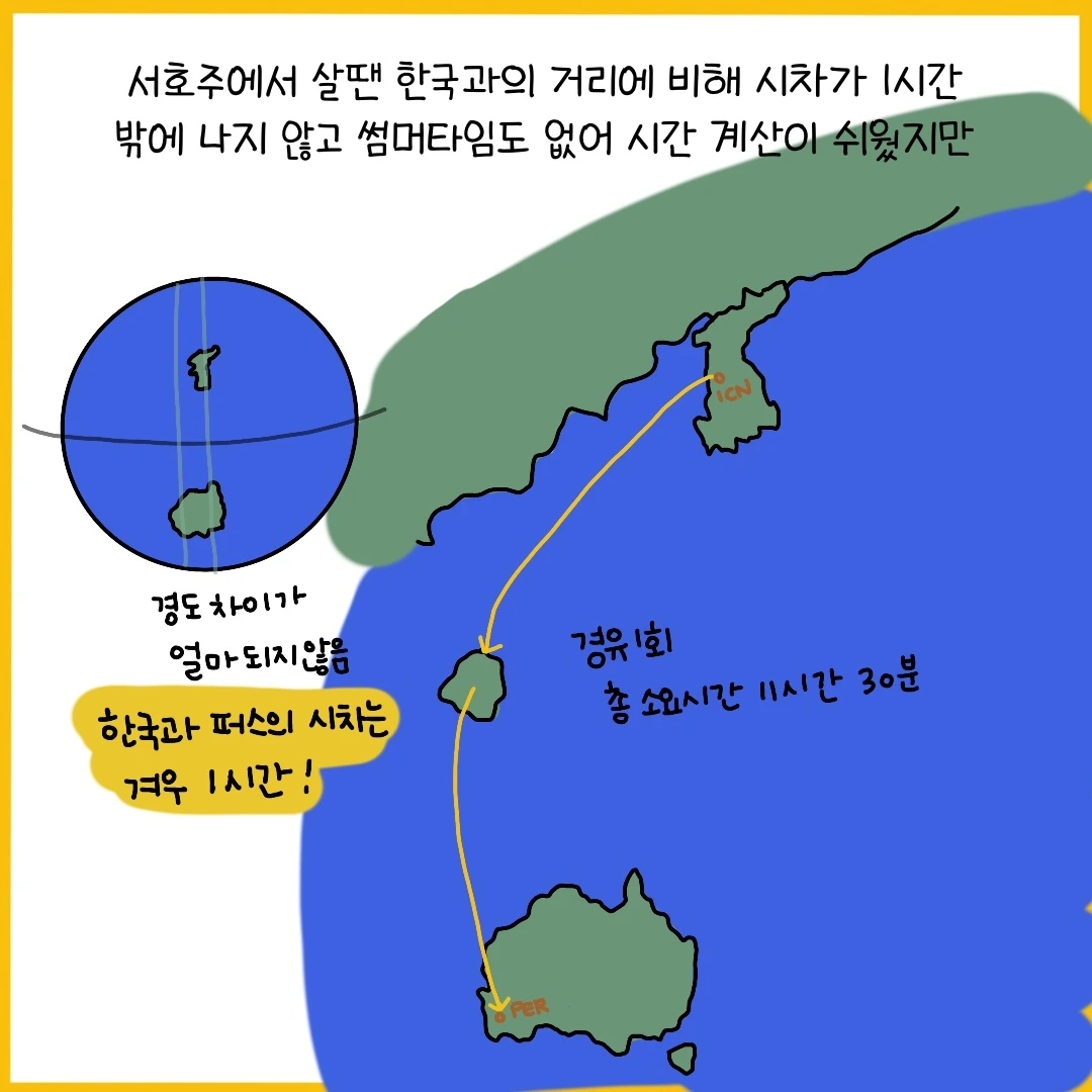 비행기로는 무려 11시간이 걸리지만 적도를 기준으로 지구를 반으로 접었을 때 서로 가까운 곳에 위치하고 있다는 이유로 호주는 한국과 시간이 비슷해 시차 적응을 하지 않아도 되는 나라이다. 시차 적응을 하지 않아도 되는 건 여행을 하면서 얻는 혜택 중 꽤 큰 범주에 해당한다. 대신 한국과는 계절이 반대로 흘러가기에 한국이 여름이면 호주는 겨울을 그리고 한국의 겨울에 호주는 여름을 맞이하게 된다. 그래서 한 여름에 비키니 입은 산타를 만날 수 있는 아이러니한 호주의 모습이다.