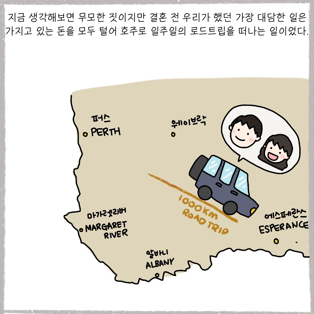20대의 끝자락에 시작한 연애. 4년의 연애 공백이 있었지만 그를 만난 이후 저는 처음인 것들을 꽤 많이 경험할 수 있었습니다. 호주에서 지내다 보면 으레 경험할 수 있는 일들이었겠지만 차도 없었고 연애도 하지 않았던 제가 경험할 수 있는 호주는 꽤 한정적이었거든요. 연애는 서로의 세계가 넓어지는 일이라는 이야기는 마치 우리의 시간들을 이야기해주는 것만 같았죠. 10년 동안 사용해 본 적 없던 운전면허증을 처음으로 꺼내어 운전을 시작하게 되었으며 태어나서 처음으로 낚시를 가고 늦은 밤 국립공원에 누워 별을 올려다보는 낭만적인 일도 경험하게 되었으니 얼마나 소중한 기억들일까요. 운 좋게 호주의 카페에서 바리스타로 일하게 된 그를 기다리는 일도 너무 즐거웠지만 카페를 유난히 좋아하는 저를 배려해 멀리 있는 카페까지 함께 바람을 쐬러 나가주던 그가 무척이나 고마웠던 기억이 납니다. 분명 하루 종일 원두 냄새를 맡으며 카페는 질릴 만큼 머물렀을 텐데 말이죠. 그래도 가장 기억에 남는 일은 우리 두 사람이 주머니에 있는 모든 돈을 탈탈 털어 로드트립을 떠난 일이 아니었나 싶습니다. 지금 생각해보면 꽤 무모한 일이었지만 그 일을 계기로 저희는 자연스럽게 결혼을 하게 되었거든요. 아마 백발의 노인이 되어서도 우리는 그 시절을 회상하면서 얼마나 즐거울까요. 저는 늘 생각합니다. 결혼을 한 건 제가 가장 잘한 일 중 하나라고 말입니다.