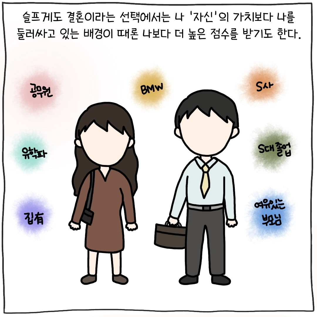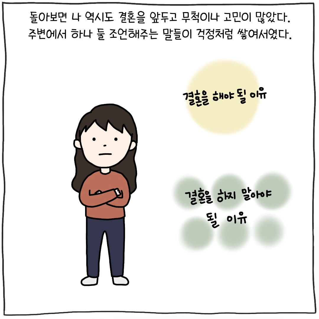 처음 남편을 만났을 때 나는 그의 배경이 그토록 결혼을 망설이게 하는 이유가 될 거라고는 상상도 하지 못했다. 우리 집도 그리 잘 산다고 할 수는 없지만 스스로 밥벌이를 하고 계시고 우리에게 짐이 되지 않기 위해 지금도 노후 준비와 그 외의 활동들을 열심히 하고 계셨기에 나는 평생 보고 자란 우리 집의 모습이 가장 평범하다고 느끼며 살아왔다. 연애를 할 땐 집을 챙겨야 하는 그의 상황이 그저 조금 이해가 안 되던 부분이었지만 결혼이라는 큰 선택을 앞두고는 몇 날을 잠도 못 자고 고민할 정도였으니 주변에서 결혼을 앞두고 고민을 하는 친구들을 보면서 그들의 마음에 자주 공감하는 편이다.