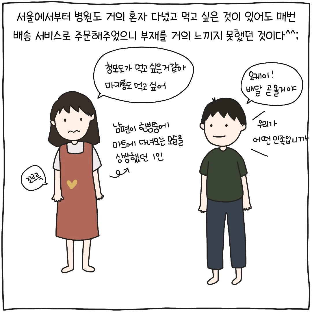 서울에 있는 동안에도 먹고 싶은 것이 있으면 늘 배달 서비스를 이용하던 남편 덕분에(?) 남편이 없어도 쿠팡, 마켓 컬리, 배달의 민족 등의 배송 서비스가 그 자리를 늘 채워주었고 남편의 카드가 비장의 무기처럼 주머니에 든든하게 있었으니 외롭거나 서러울 겨를이 전혀 없었던 모양입니다. (짝꿍이 들으면 꽤 섭섭할 말 입니다만^^;)