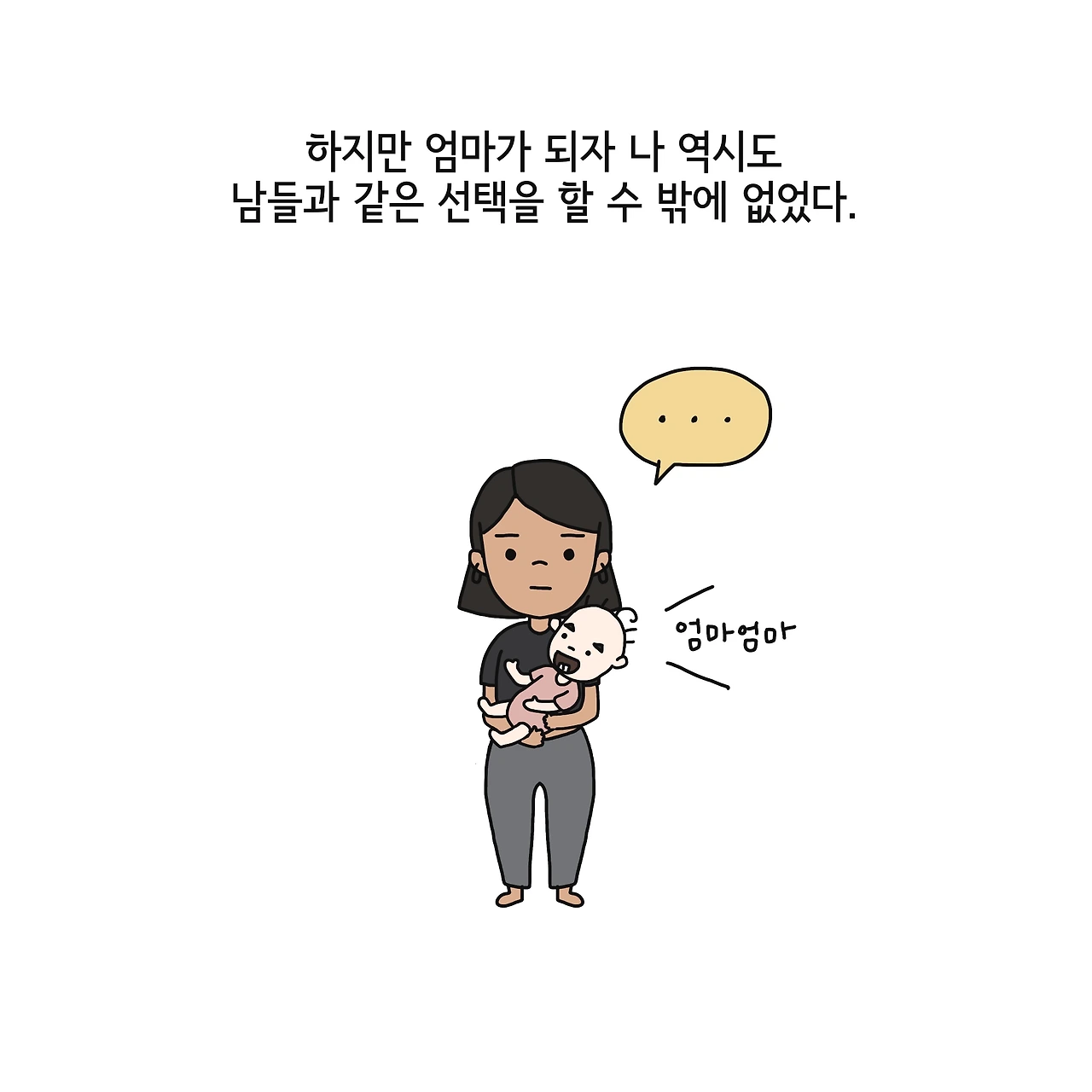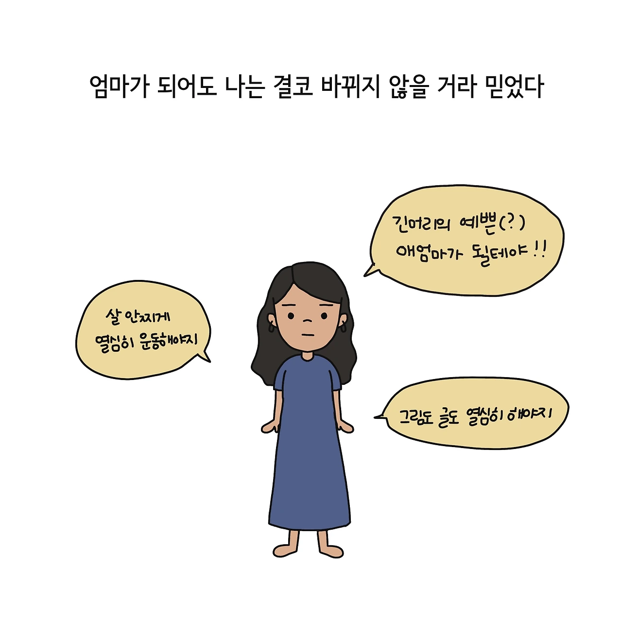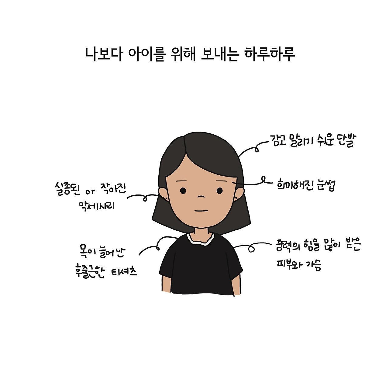 엄마가 되기 전에는 아기 엄마가 된 친구들이 하나 둘 단발머리를 하는 일이 이해가 되지 않았습니다. 놀러 갈 때마다 늘 입고 있던 얼룩덜룩한 티셔츠나 무릎이 한참 마중 나온 바지도 말이죠. 막상 아기 엄마가 되자 겨우 육퇴를 하고 하루 종일 찌든 몸을 씻고 나오면 머리를 말리는 것이 늘 성가신 일이었고 하루 종일 아기가 매달려 있는 티셔츠에 분유, 이유식, 눈물, 콧물 같은 것들이 묻어나는 것도 무척이나 자주 있는 일이었습니다. 결국 길게 기른 머리카락을 댕강 잘랐고 아기를 돌보기에 가장 편하고 부담 없는 옷들만 매일 돌려가며 입는 삶을 저도 시작하게 되었습니다.