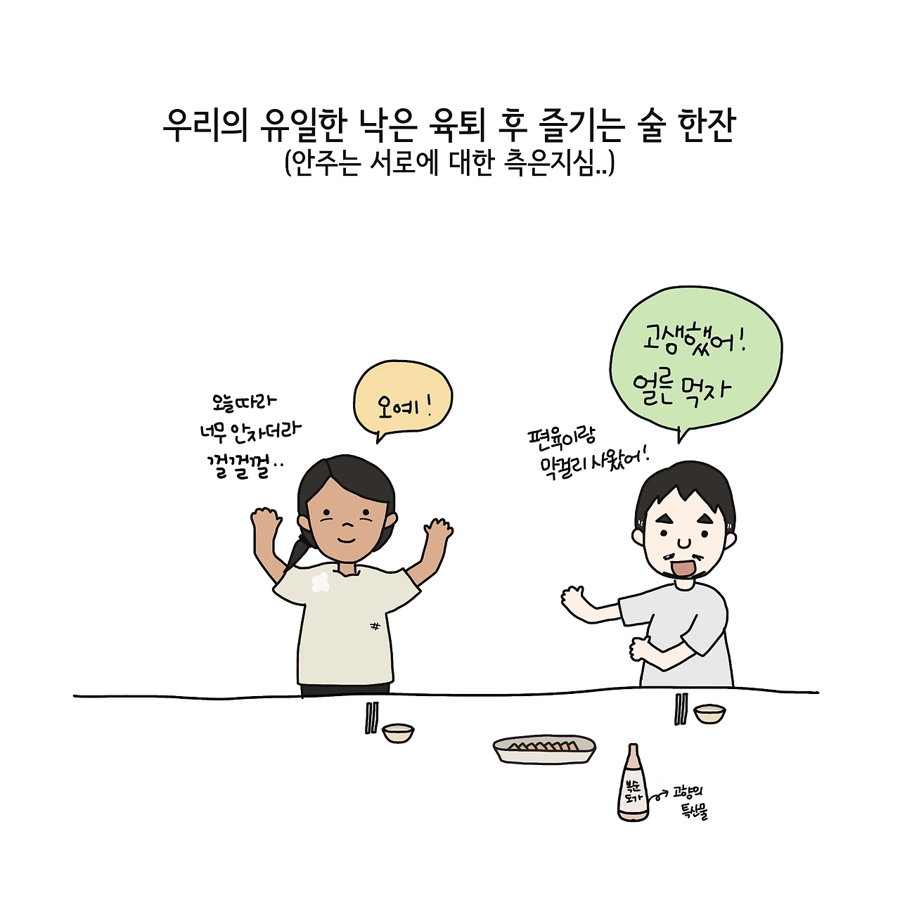 아기를 겨우 재우고 나와 이유식이 얼룩덜룩 묻어있는, 늘어난 티셔츠를 벗고 있노라면 부엌에서는 부쩍 흰머리가 나기 시작한 짝꿍이 설거지를 하고 있습니다. 예전에는 든든한 뒷모습을 보면 가끔(..?) 설레기도 했는데 요즘은 왜 이렇게 안쓰러운 마음이 드는 걸까요. (아마 남편도 지쳐 잠든 저를 보면서 같은 생각을 하겠지요..) 저는 요즘 부부에게 가장 중요한 덕목 중 하나는 '측은지심'이라는 생각을 합니다. 그게 아니고서야 부부라는 존재가 이렇게 끈끈해질 수는 없는 것일 테니까요.