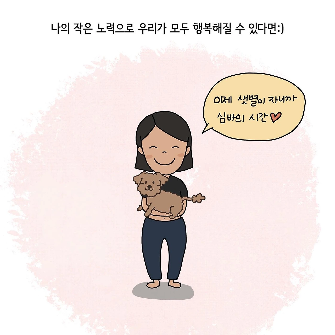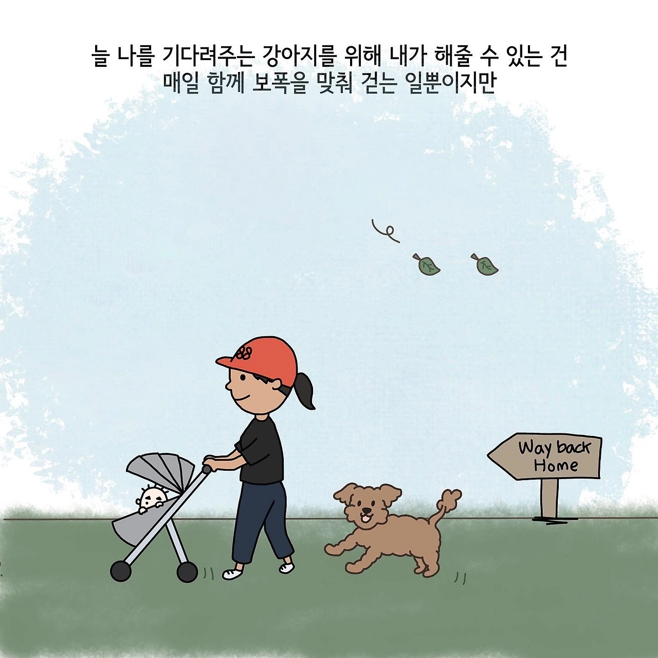 앞으로 얼마나 더 많은 날들을 우리가 함께 걸을 수 있을까요. 어느덧 샛별이가 걷기 시작하면, 또 유치원에 들어가게 되면 다시 저와 심바는 오롯이 둘이서 걸음을 맞춰 걷게 되겠지요. 그땐 기다려줘서 고맙다는 말을 매일처럼 하게 될 것만 같습니다. 먼 훗날 심바가 떠나는 날이 오면 부디 저와 함께 걸었던 기억들을 안고 행복하게 가길 바라봅니다. 그 장면을 떠올리면서 늘 바닥에 누워있고 싶은 제 자신을 토닥거립니다. 오늘도 심바는 저와의 산책을 기다리고 있으니까요:)