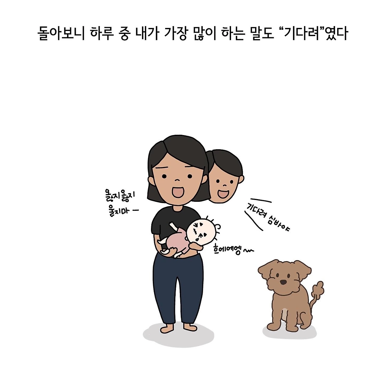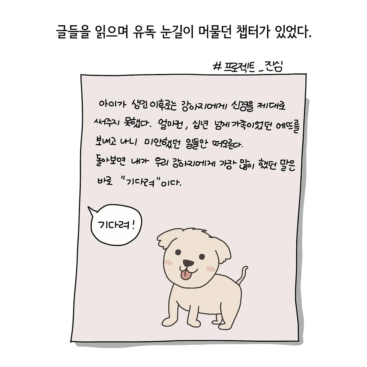 얼마 전, 반려동물을 키우는 사람들이 쓴 글들을 모은 독립출판물의 서평을 부탁받았습니다. 각자의 아름다운 사연이 담긴 글들을 읽으며 여러 번 울컥거렸지만 그중에서도 마음이 꽤 오래 머물렀던 글은 지금 저의 상황을 그려놓은 듯한 한 여성분의 글이었습니다. 아이가 생기고 강아지에게 점차 신경을 쓰지 못하는 동안에도 시간은 가차 없이 흘렀고 어느덧 그녀의 강아지가 세상을 떠났다는 이야기가 담겨있었지요. 정신을 차리고 문득 돌아보니 그녀가 가장 많이 했던 말은 바로 "기다려"라는 세 글자.