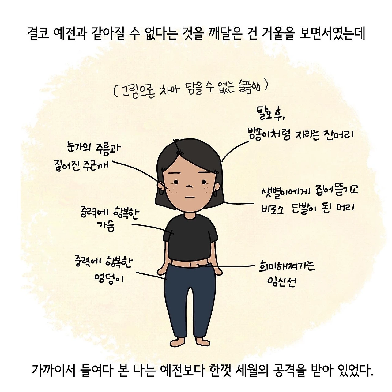 요즘은 거울을 볼 때마다 문득 슬퍼지곤 합니다. 다시는 돌이킬 수 없을 만큼 짙어진 주근깨와 깊어진 주름 그리고 힘없이 빠지는 머리카락들 때문이지요. 한 때는 머리카락 빠지는 게 무서워서 머리 감는 시간이 가장 두렵기도 했습니다. (머리숱이 빈약한 자의 슬픔이여….) 모유수유를 하며 중력의 힘을 한껏 받은 가슴과 운동할 시간이 없어 힘없이 축 처진 엉덩이까지 볼 때면 ‘아이를 낳고 참 많이 변했구나’라는 생각에 문득 울적해지기도 합니다. 산책을 할 때마다 삐걱거리는 골반이나 너덜거리는 손목도 우울함의 무게를 더해주는 요인이기도 하지요.