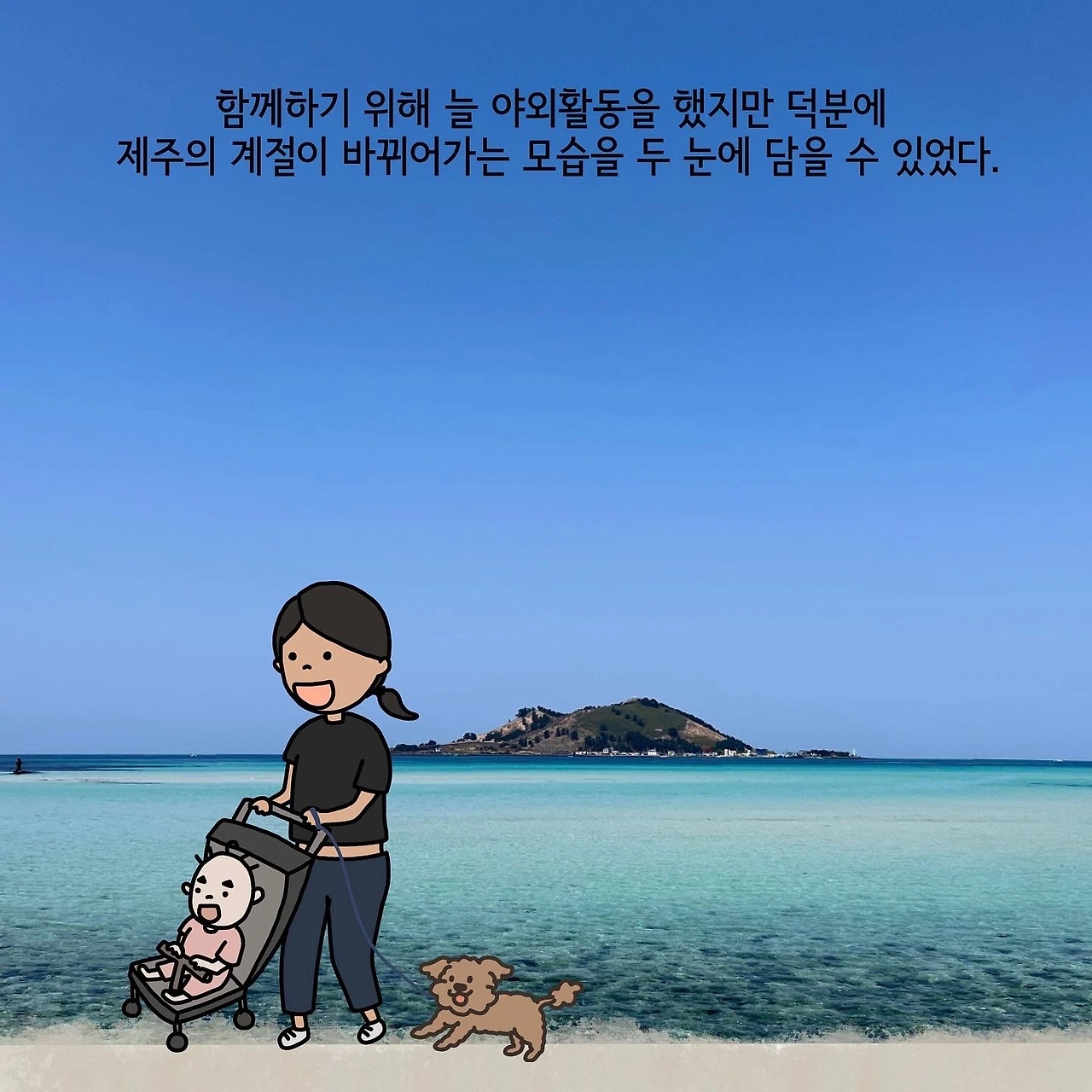 여러 선택지를 제외하고 나면 네 식구가 함께 갈 수 있는 곳이 한정적이지만 그럼에도 불구하고 넷이 함께 할 수 있다는 것만으로도 제주에서의 한 달은 충분히 아름답고 따뜻한 시간이었습니다. 포기해야 하는 것들이 분명 너무나도 많지만 이 작고 귀여운 생명들이 주는 행복은 아마 세상 그 무엇과도 바꿀 수 없는 것이 아닐까요.