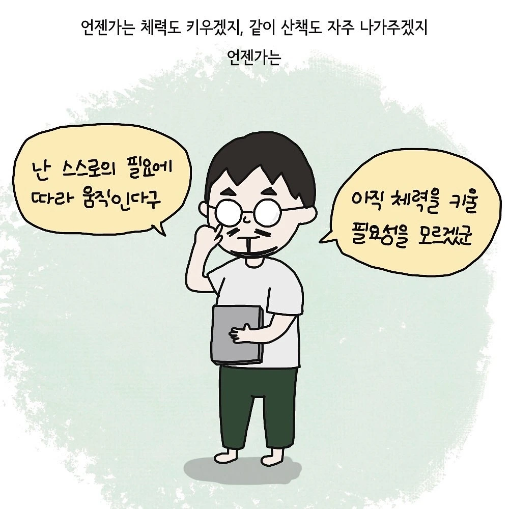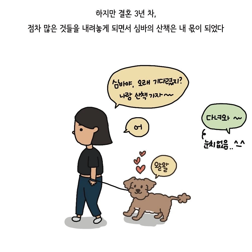 밖을 유난히 좋아하는 강아지와 아기 덕분에 하루 한 번은 꼭 산책을 나갑니다. 물론 집에서 하루 종일 따라다니며 뒤치다꺼리를 하는 것보다 유모차를 밀거나 등에 엎고 산책을 나가는 일이 차라리 덜 힘든 이유도 있지요. 육아는 무척이나 고되고 힘들지만 산책을 나가서 동네 어른들께 밝게 인사를 하는 아기를 볼 때마다, 풀냄새를 잔뜩 맡으며 행복해하는 심바를 볼 때마다 늘 보람과 행복을 느끼는 것 같아요. 그래서 늘 지친 몸을 이끌고 운동화를 신게 되는 엄마입니다. 아마 몇 년 후에는 아이도 더 이상 함께 산책을 나가는 일보다 친구들을 만나러 가게 될 테고 심바도 점점 나이가 들어 산책을 힘들어하게 되겠지만 그 언젠가를 생각하면 두 녀석을 위해 하루하루 함께 걷는 시간이 소중하지 않을 수가 없답니다. 그리고 언젠가는 남편도 곁에서 걸음을 맞추며 자주, 함께 걸어주지 않을까요? 이 행복한 시간을 일주일에 한 번만 공유하는 건 너무 아쉬운 일이잖아요.