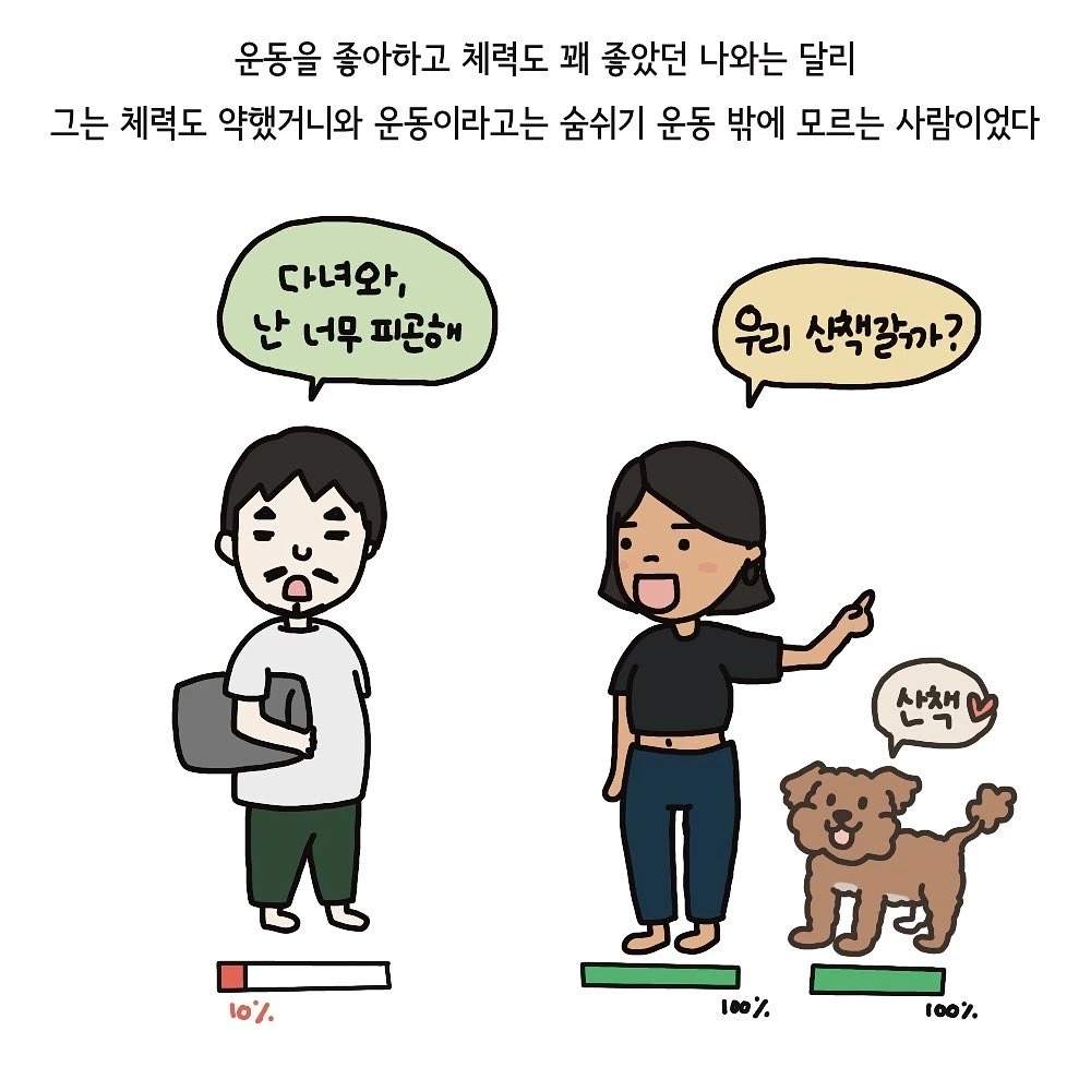 다른 부부들도 마찬가지겠지만 저희는 성격도, 성향도, 취미도 매우 다른 두 사람입니다. 같은 공감대라고는 술을 좋아하는 일? 정도가 있을 것 같아요. 그런 저희가 가까워진 것은 어쩌면 호주라는 특수한 공간에서 만났기 때문일지도 모른다는 생각을 하곤 합니다. 무튼, 덤벙거리고 일 벌이기 좋아하는 저와는 달리 남편은 꼼꼼하고 객관적인 성격의 사람입니다. 체력 또한 두 사람이 너무나 달라서 체력이 방전될 때마다 잠을 자는 남편과는 달리 저는 사람을 만나야 에너지가 충전되는 타입의 사람이랍니다. 그러다 보니 하루 중 꼭 필요한 산책시간도 10할 중 9할이 저의 몫이 되었습니다. 강아지만 산책시킬 때는 그리 어렵지 않은 일이었는데 요즘은 아기까지 셋이서 함께하는 산책길이 꽤... 고단하기도 합니다. 남편과 함께 산책을 나가고 싶지만 남편은 산책 시간이라도 고요하게 혼자 쉬고 싶은 모양입니다. 아마 산책은 앞으로도 늘 저의 몫이 되겠지요? (쿨럭)